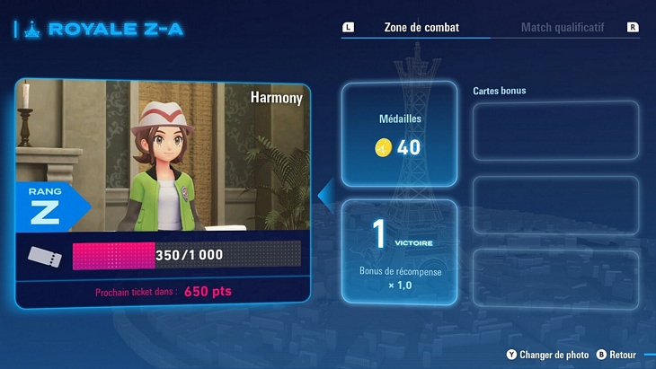 L'application Royale Z-A enregistre votre rang, le nombre de points que vous avez obtenus, vos médailles, ainsi que d’autres données de combat.