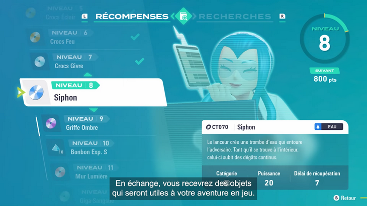 En complétant des recherches, vous recevrez de l'expérience et monterez de niveau, ce qui vous permettra de récupérer des objets comme des Bonbons Exp. et des CT en récompense.