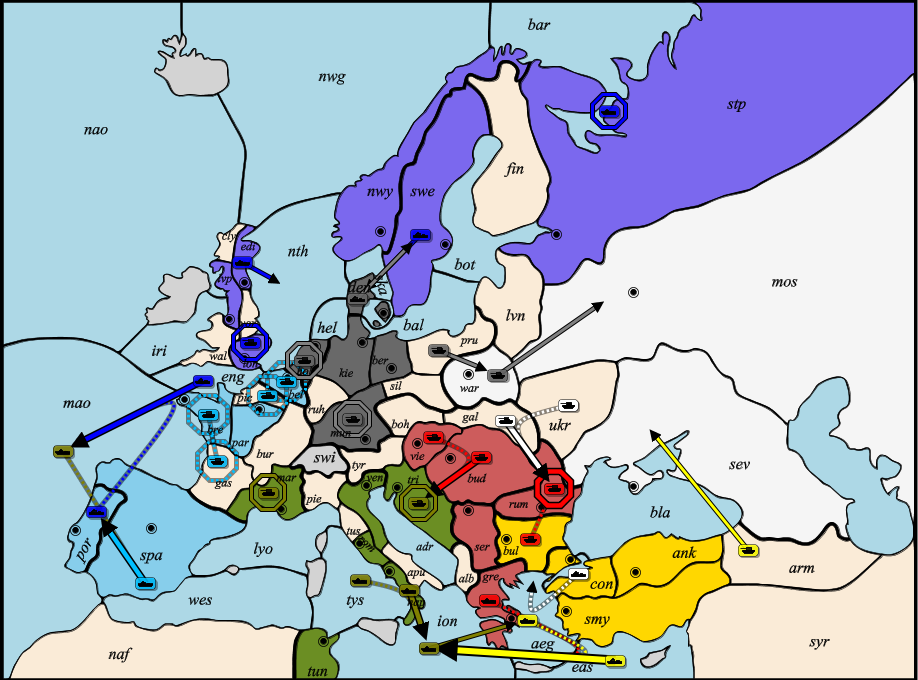 - Russie : Un tour qui fait mal, l'épine en STP sera particulièrement difficile à retirer, les troupes à l'Est vont tomber surtout si l'Autriche et l'Allemagne s'y mettent et la flotte en BLA aura peu de choix à part défendre SEV, si elle ne trouve pas une solution rapidement, la partie risque de se finir subitement pour le tsar. Une alliance avec l'Allemagne semblerait la seule issue possible.