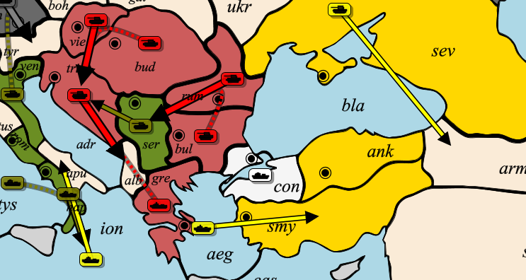 - Turquie : On s'est enfin décoincé, l'armée en Arménie est particulièrement menaçante. S'allier à l'Italie ou l'Autriche lui donne des options intéressantes pour progresser dans les Balkans.