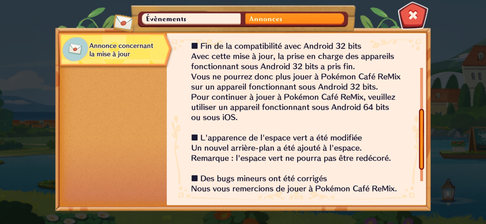 La prise en charge des appareils Android 32 bits a pris fin et vous devrez désormais avoir un appareil Android 64 bits ou un appareil iOS pour continuer à jouer au jeu !Apparence de l'espace vert modifiée