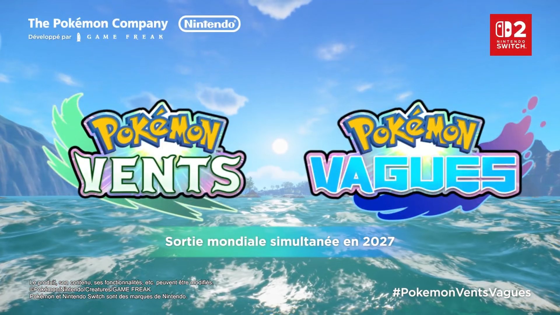 Pokémon Vents et Pokémon Vagues seront disponibles en exclusivité sur Nintendo Switch 2 et sortiront en 2027. Le jeu est confirmé comme étant un monde ouvert, où il semblerait que nous soyons en mesure d'explorer les fonds marins.