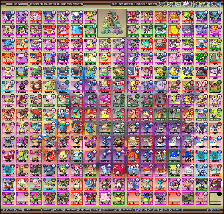 Agrandissement :Même carte que la précédente mais en plus grande, avec quelques nouveautés pour combler le vide des bordures : Remplacement de l'immondice qu'est le mot shiney pour le mot shinies, pluriel de shiny ; Remplacement des 9 personnalisés par le 9 de l'écriture de Visitor TT2 BRK ; Changement de couleur des bordures par défaut par des couleurs du fond pour un meilleur rendu ; Changement de couleur des nombres de rencontres du gris (défaut) en une couleur venant du Pokémon de la case dresseur ; Rajout d'un petit indice en bas à gauche marquants donc les shinies que je compte vraiment (c'est-à-dire pas de Pokéradar, pas de Safari des Amis, etc.) ; Changement de couleur du fond de la case dresseur pour la même couleur que les bordures, mais à 50% de visibilité. Date de dernière modification : 04/03/2015