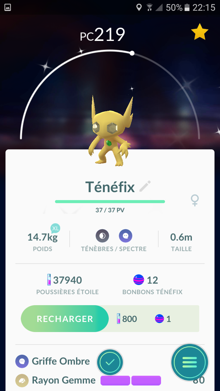 Edit : 3EME SHINY SANS CHEAAAAAAT DE SAPHIR ALPHA !!!! \o/ 3EME SHINY DE MA VIE RENCONTRE PAR HASARD SANS EVENTS ETC !!!!! \o/ ... Oui, je me calme et je raconte. :D Donc. J'allais entrer au site Météore, et juste avant je sais pas pourquoi j'ai pensé "Bah tiens je vais casser le rocher à côté là, je sais pas pourquoi je le sens bien j'dois pouvoir récupérer un objet ou quelque chose." Linéon utilise Eclate-Roc. Combat. "Et merde... Bon, remarque ça sera un Racaillou et j'en ai pas encore capturé." (Je rappelle que pour une fois j'essaie de tous les attraper ^^) Racaillou jaune. Cercle de petites étoiles et "schtling". Cœur qui s'emballe, "OH PUTAIN C'EST UN SHINY OH PUTAIN !" x) Bref, Rapide Ball (oui, je suis contente, j'ai acheté un stock de 10 Rapide Balls en arrivant à Autéquia, même si 10000 Pokédollars c'est pas donné à ce niveau du jeu.), et je l'ai eu. ^^ Je crois que mon taux de rencontre de shinys a dû augmenter avec le fait que j'aie donné une potion au gamin, et je pense essayer de reseter les légendaires ^^ Et faut que je remplisse ma section "Poké-Chromatique" moi ^^