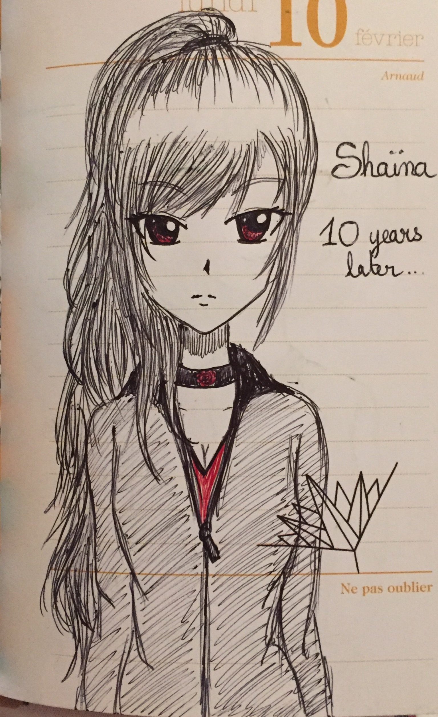 La couleur de la lumière. Du coup pendant que je m’ennuyais en cours j’ai eu l’envie soudaine d’écrire un très court synopsis de ce qui aurait été le volume 2 de la fiction, censé se dérouler 10 ans plus tard, et de dessiner brièvement ce à quoi ressemblerait la protagoniste, Shaïna, à 25 ans. Le tout sur mon agenda.