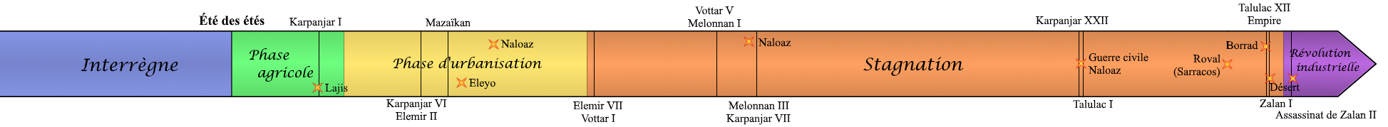 La dynastie s’arrête en 267. Le fleuve Jussabal, infranchissable, a été atteint depuis longtemps ; dans le Kuzivaï, le royaume de Kojar ignore l’influence de Taezïoud et cherche à percer ses défenses par de petites incursions : s’étant développé dans une position moins favorable, il a appris plus tôt à se reposer sur la guerre. Alors Karpanjar VI part en guerre pour répondre à ces incursions, et meurt au combat sans héritier. Une générale de Lajis sauve la mise en annulant l’invasion manquée, et devient reine sous le nom d’Elemir Ière.