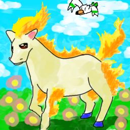 Enfin, les lecteurs de Pokémon RESERVoir CHRoNiCLE les reconnaîtrons. Eh oui, ce sont bien Rapidash et Goelise (Shiney), des Pokémon de Shaolan et Sakura. Sont-ils pas mignons, malgré les nombreux défauts de l'image ?