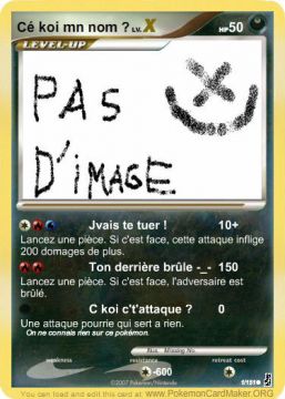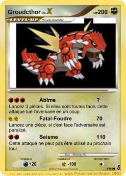 C'est la fusion de Groudon et D'Electhor (présente en grande image sur ma galerie) en carte pokémon. Pas mal hein ? Lâchez des coms svp ^^ Si vous voulez créer votre propre carte pokémon, cliquez-ici.