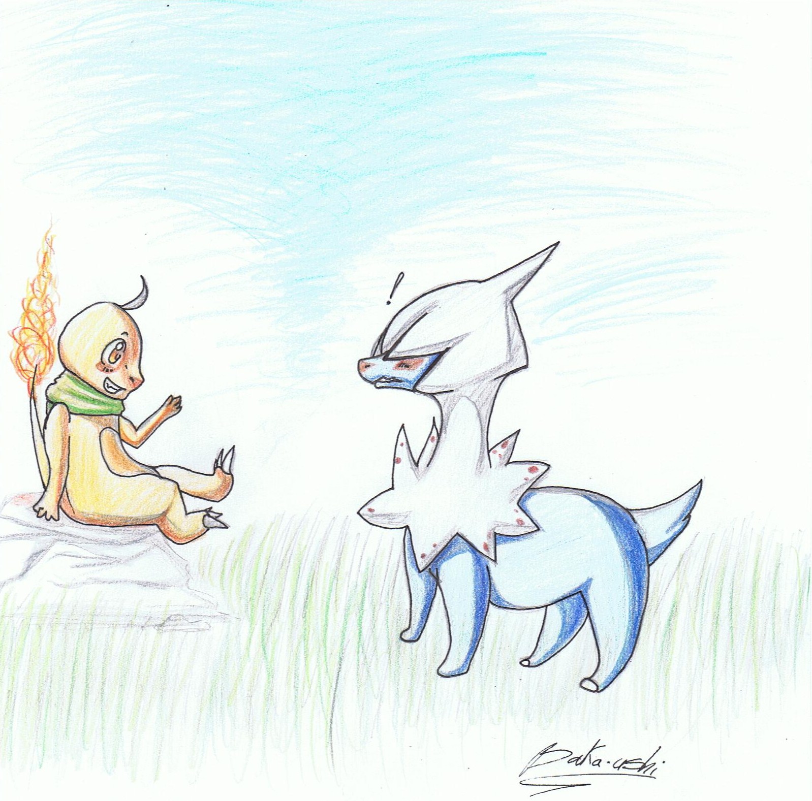 Oui je sais ça choque de salamèche>à Pyroli mais j'en avais marre des bipèdes ! :X C'est assez difficile à dessiner ... Et puis les poses sont galères !!
