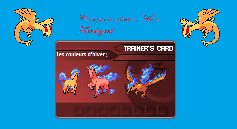 Pour cette hiver, voilà une petite carte dresseur avec des recolos sur le thème de l'hiver. De la collection "Hiver Famboyant". J'ai colorié toute les flammes en bleu puis, j'ai recolorier ponyta aux couleurs de salamèche, galopa aux couleurs de reptincel et sulfura aux couleurs de dragaufeu. Voilà les trois top model chez les pokemon!Ah! J'ai aussi recolorier lugia au couleur de sulfura...