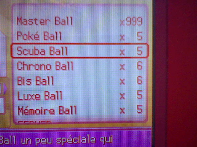 balls qui m'apartienne:master ball 999,pokeball 5,chrono ball 6,scuba balls 6,bis balls 6,luxe balls 5,mémoire ball 5 demander en moi si vous vouler.