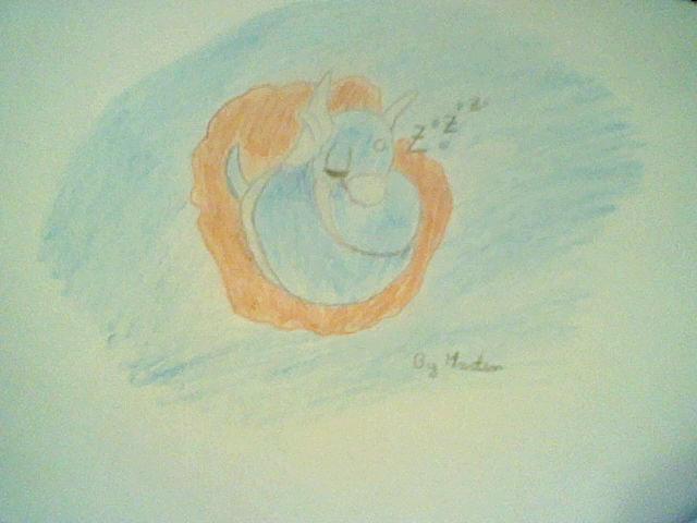 Alors sa c'est un mini-draco qui dort sur un rocher dans une rivière. Toujours fait au crayon de couleur, j'ai prit une heure à le faire; Pour le faire ressortir j'ai recouvert la feuille de papier buvard et voilà le travail^^