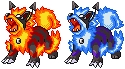 Voici la seconde version de Ember Arcanin ;) Je me suis débrouillé pour trouver un rouge pour les rayures de celui de gauche,comme on me l'a fait remarquer dans les commentaires,qui ne soit pas du même ton que celui du bord des flammes. J'ai opté pour le violet de Raikou pour celui de droite. Sinon,j'ai fais un petit ajout pour relier l'oreille et l'oeil,ajouté des cornes,un petit crâne(provenant de Démolosse) sur le buste et des griffes sur les pattes avant(celles de Groudon). La V3 comportera de nouveaux ajouts et il y a possibilité que je change les couleurs pour celui de droite. Si vous avez des suggestions je suis preneur. Je n'utiliserai que les sprites de RSE cependant.