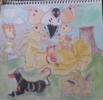 Autre dessin que j'avais fait il y a 3 ou 4 ans. Il représente Luana, l'un des personnages principales de ma fanfic ''Une amitié à toute épreuve'', avec ses Pokémon : Pyrax ( avec une drôle de tronche sur mon dessin ... ), Feunard, Simiabraz, Braségali, Démolosse ( avec sa cicatrice sur le flanc ) et Pyroli chromatique. D'ailleurs, je l'adore mon Pyroli x3