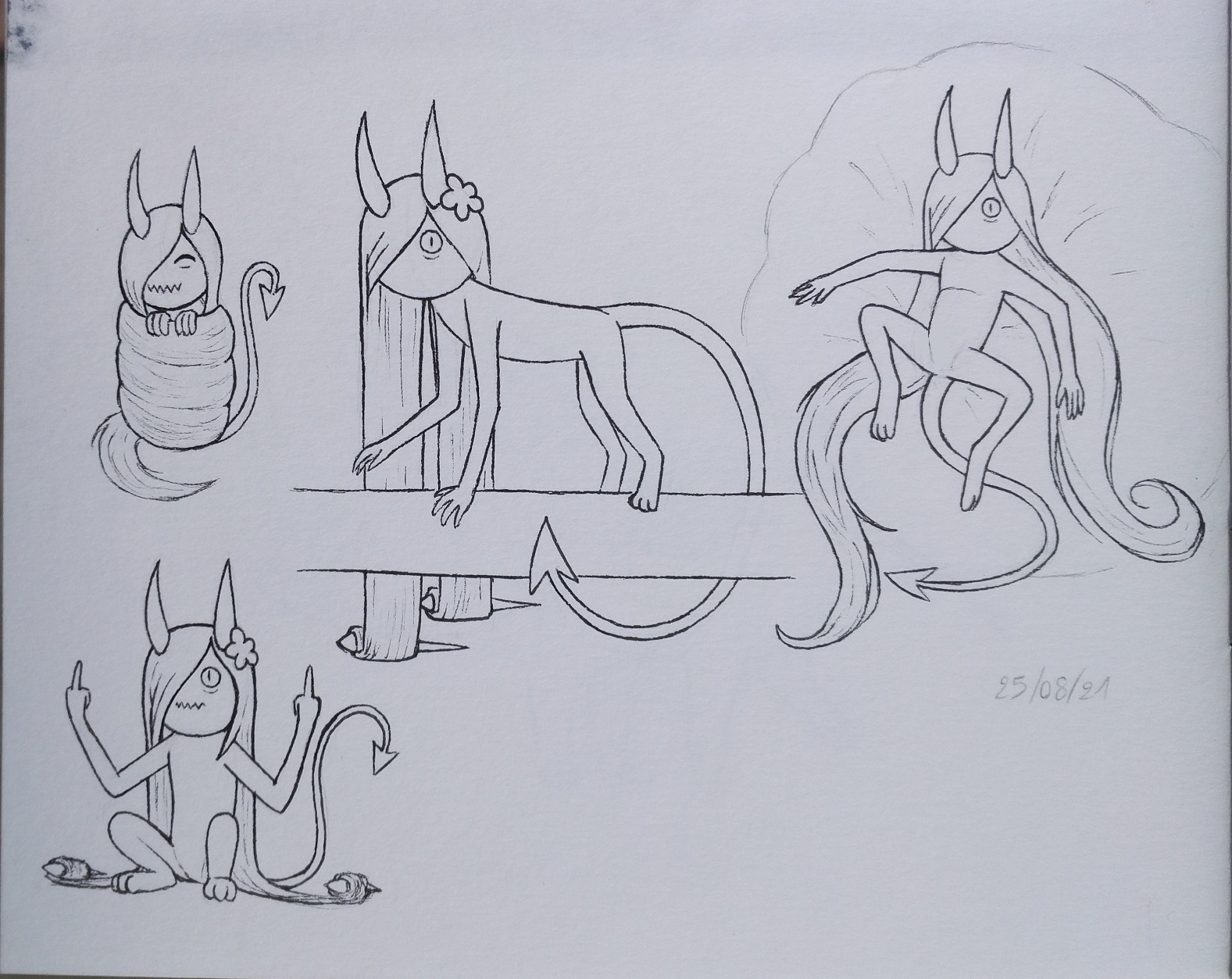 J'espérais trouver une pose plus dynamique mais comme rien ne venait je suis passée immédiatement du brouillon au design du personnage. Je n'ai pas eu à faire beaucoup de tests avant de trouver l'apparence finale. Le pire c'est que j'ai aussi réfléchi à l'apparence de ses organes génitaux >.> Pour les écailles de son ventre je me suis basée sur le crocodile. Je l'ai fait assez vite, entre le 16 et 19/02/21.