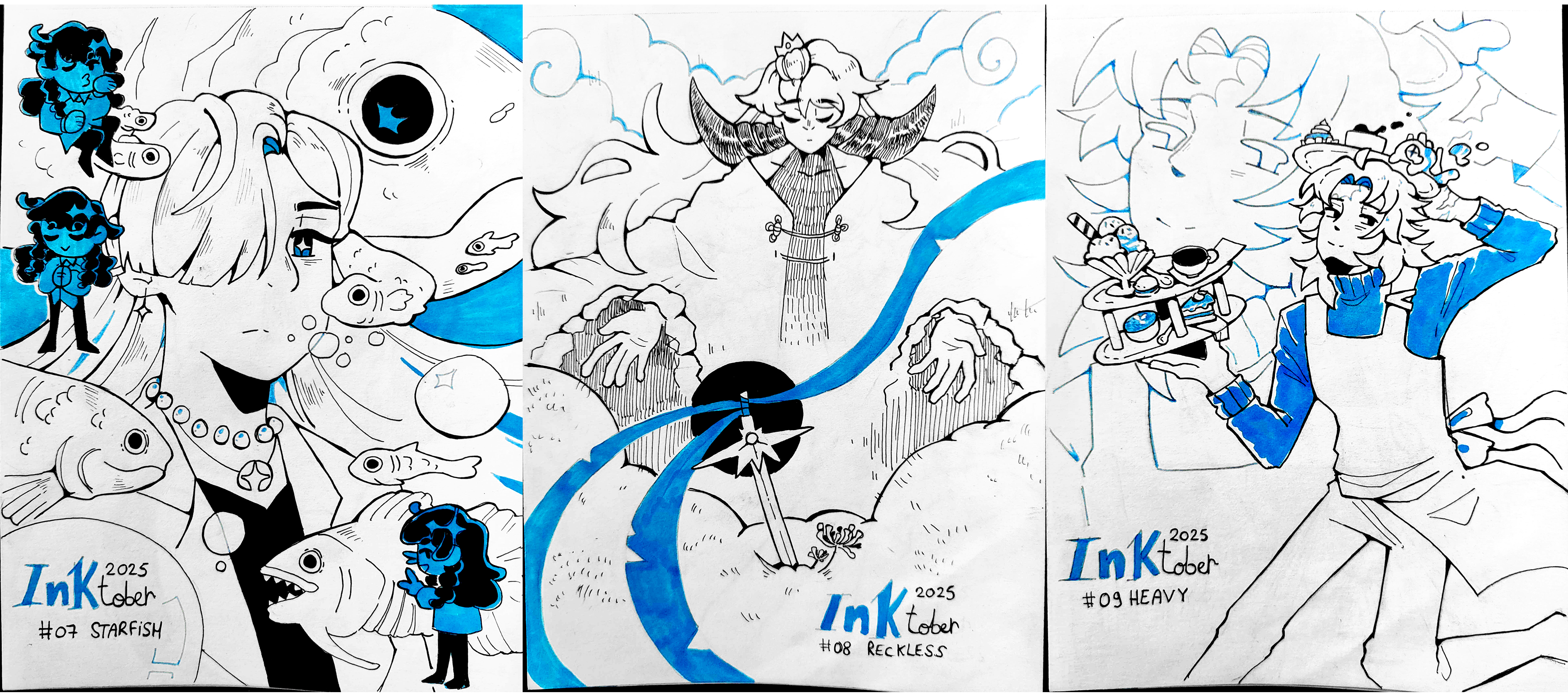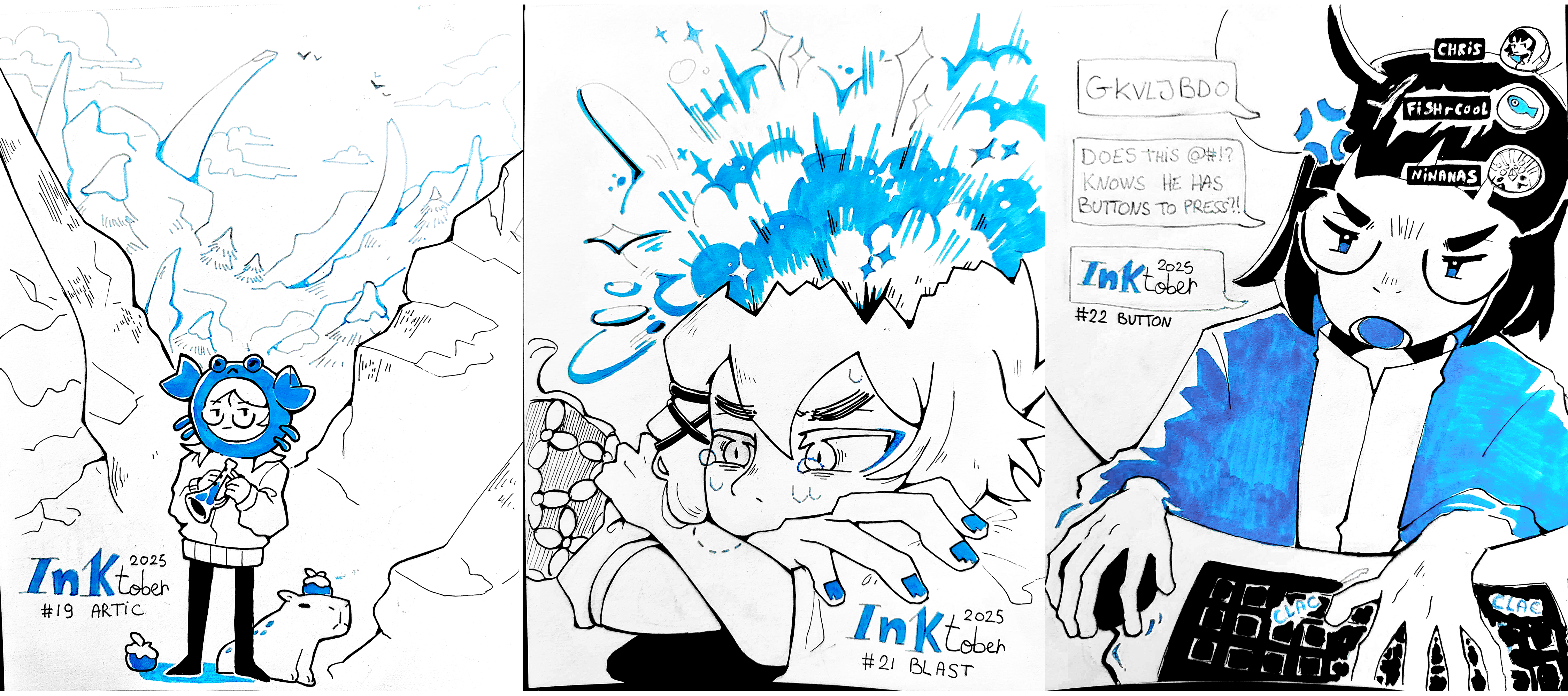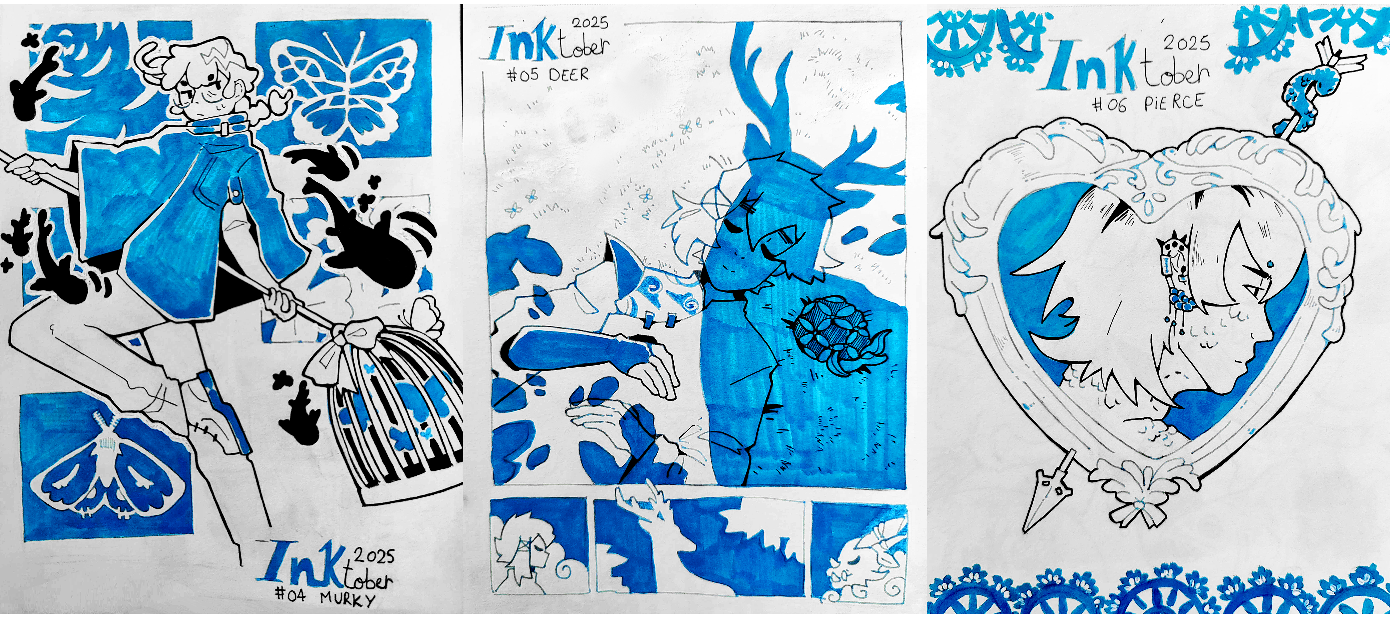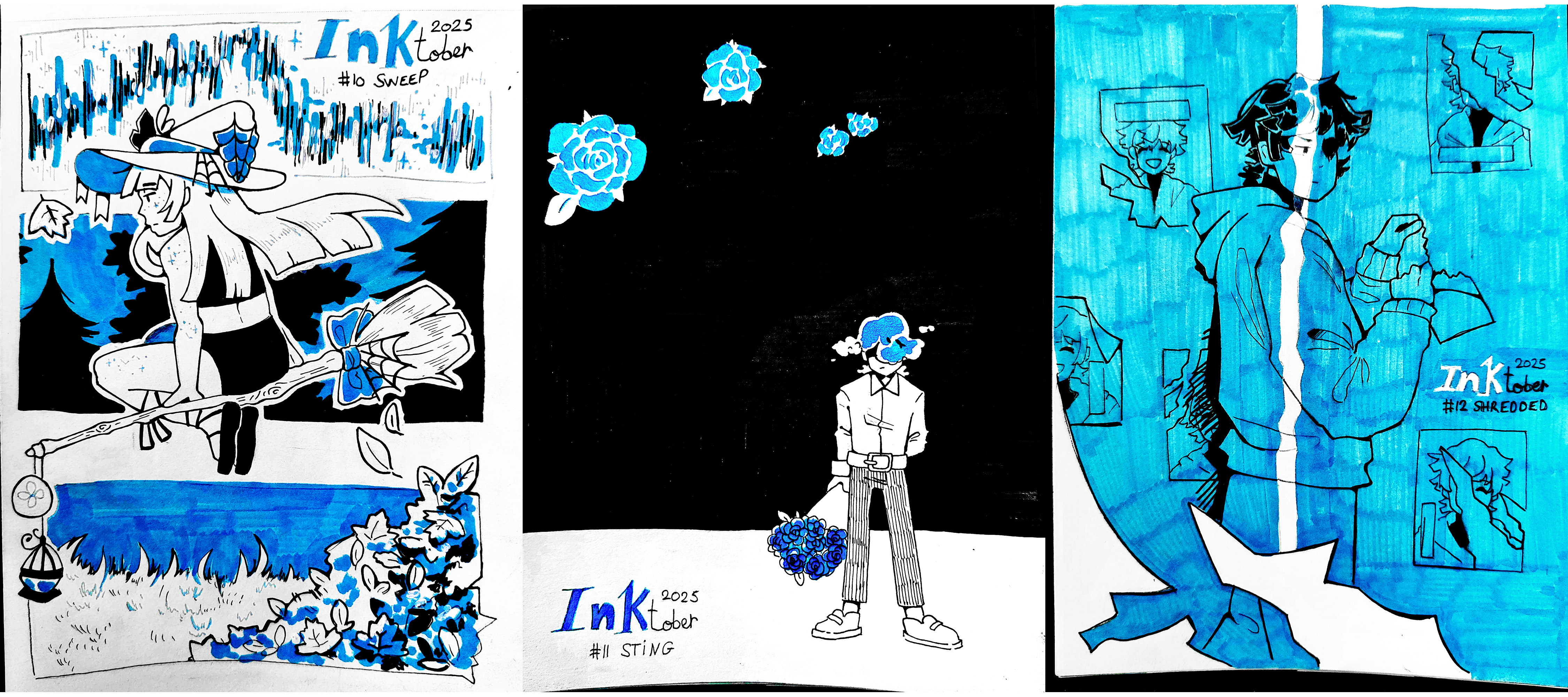 Janvier 2026, le moment parfait pour poster mon inktober 2025. (Réalisé en octobre, juste les photos et quelques retouches cette semaine) Selon la liste officielle cette année. J'ai l'impression que ça m'a fait travailler plus la composition, moins les décors. Avec du bleu ! Ce sera sûrement du vert ou orange pour 2026, on verra.