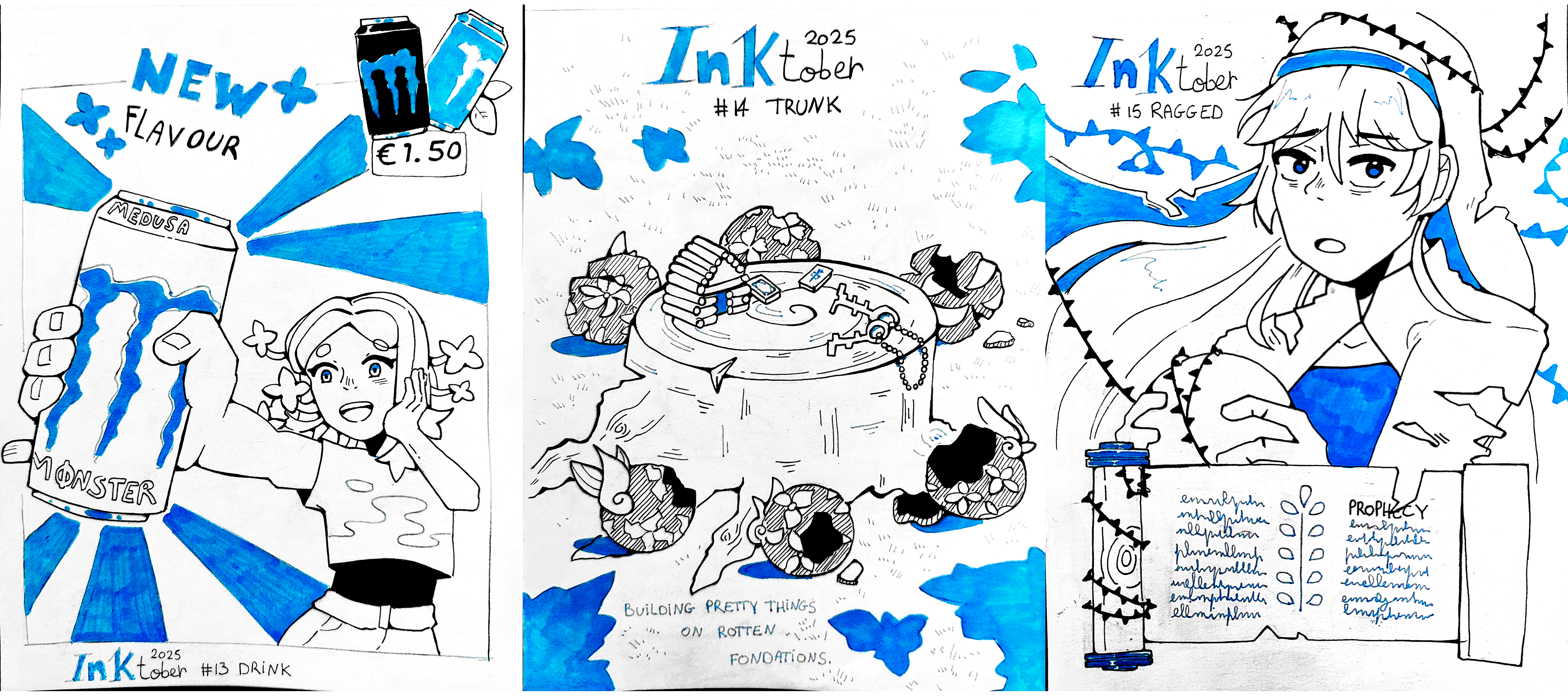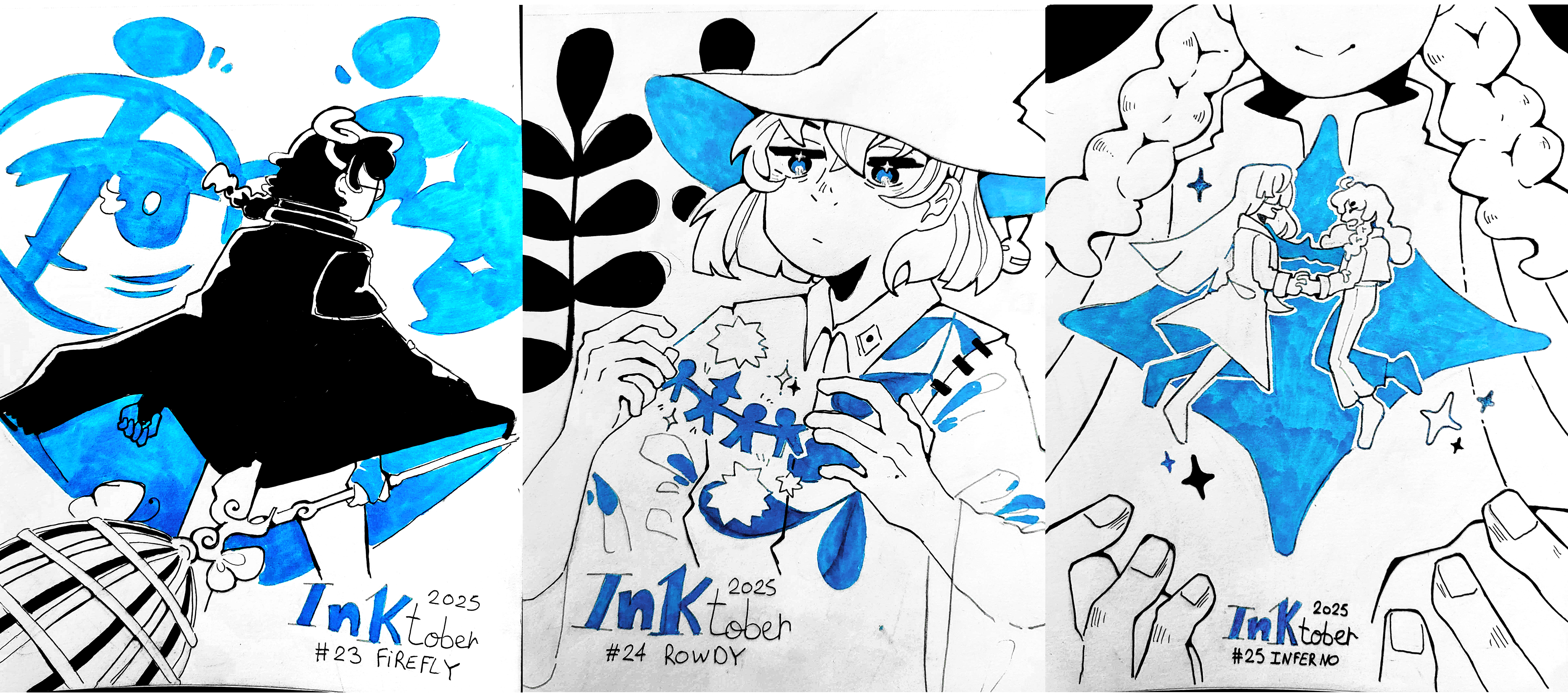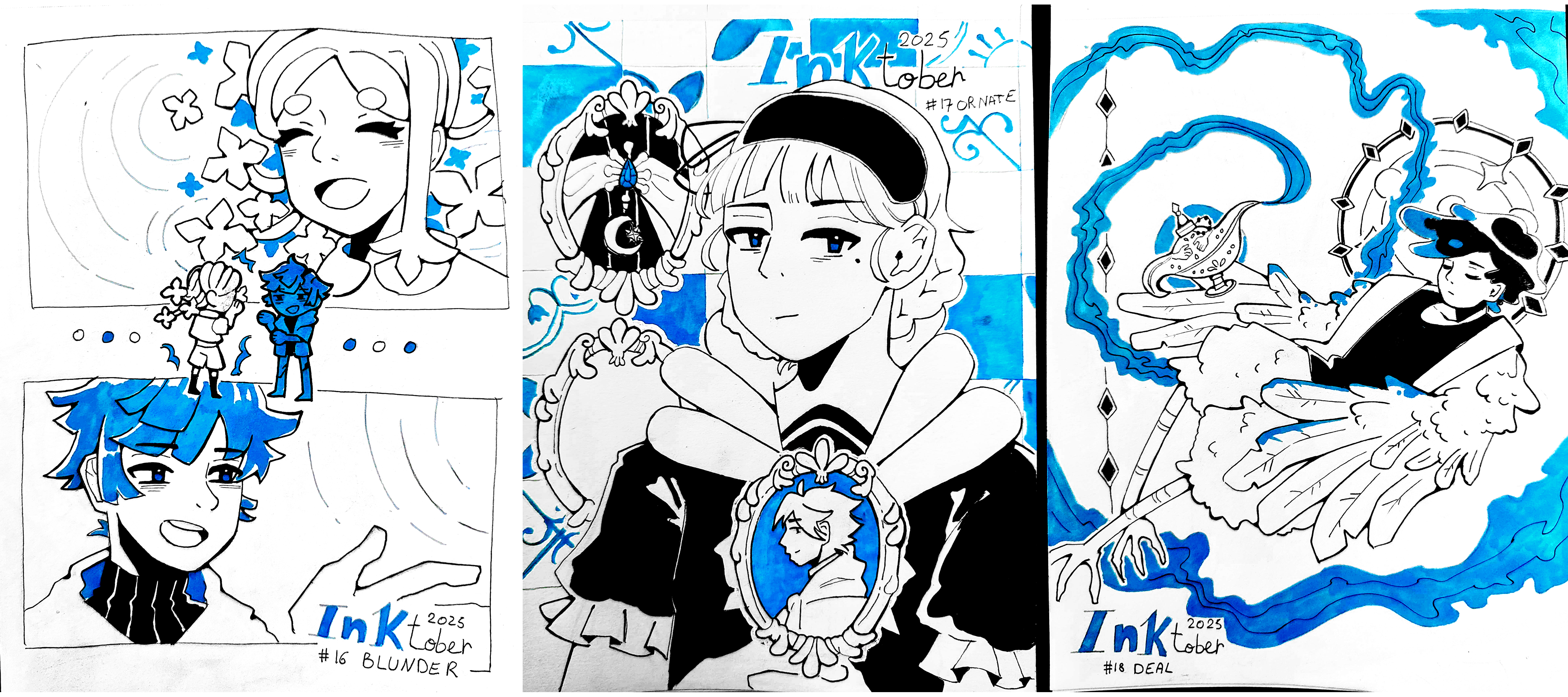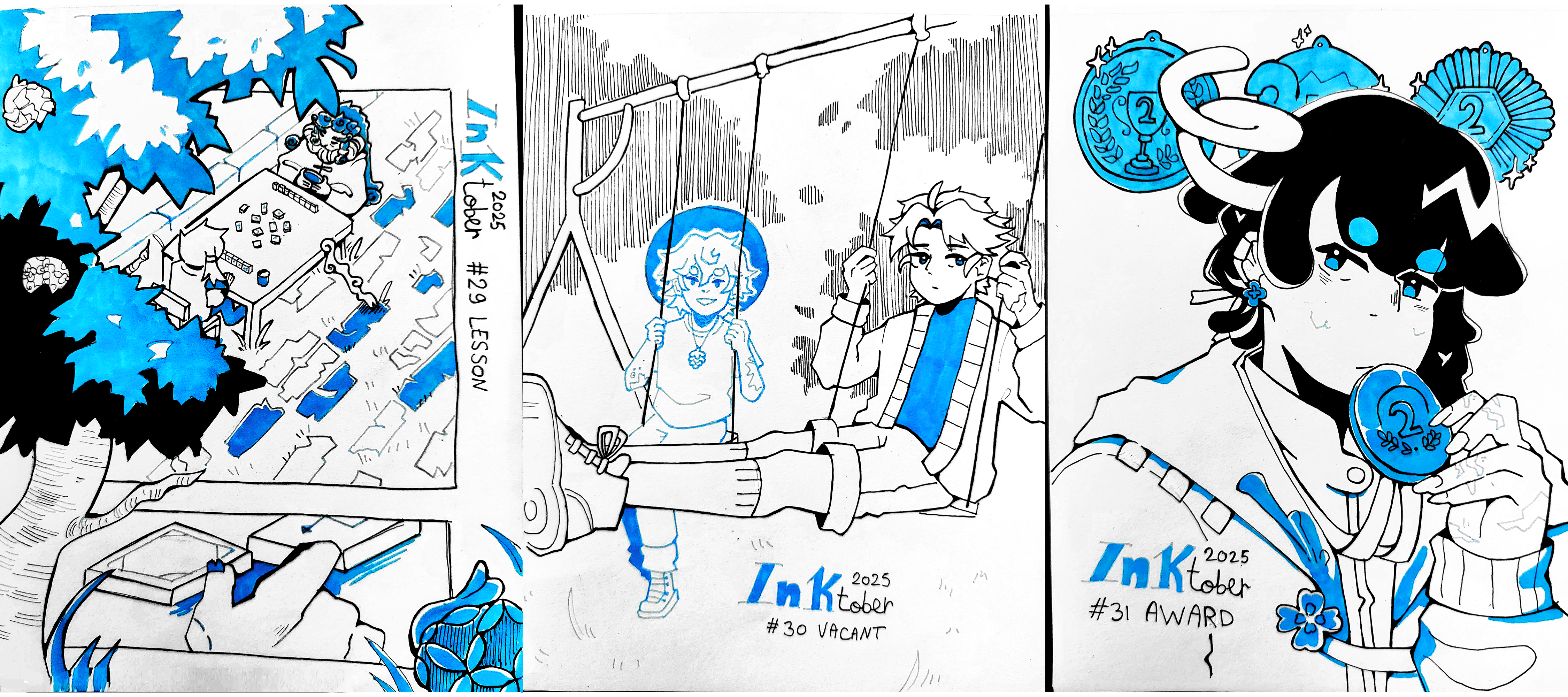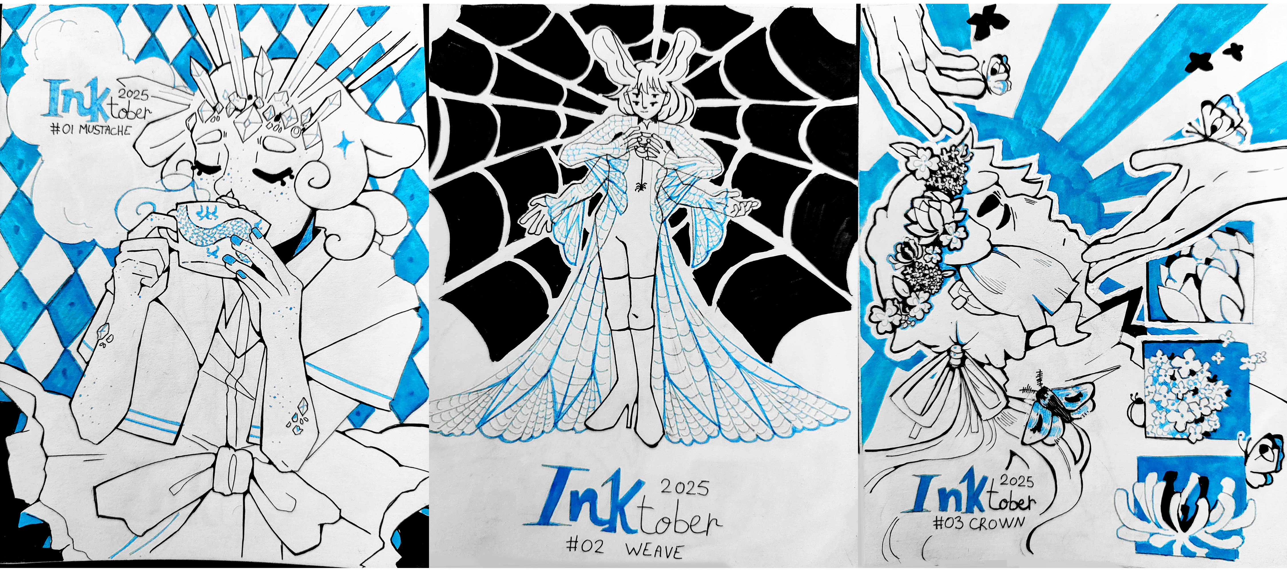 Janvier 2026, le moment parfait pour poster mon inktober 2025. (Réalisé en octobre, juste les photos et quelques retouches cette semaine) Selon la liste officielle cette année. J'ai l'impression que ça m'a fait travailler plus la composition, moins les décors. Avec du bleu ! Ce sera sûrement du vert ou orange pour 2026, on verra.