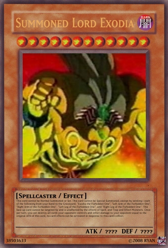mais il exsite des carte d'exodia le maudit en une seul carte on voit tout exodia et j'en nais une et en plus sur ma carte on le voit attaquer