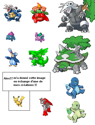 A votre avis, je l'ai fait avec quelle pokemons(4)... Celui qui Trouve a le droit de me passé une commende pas trop difficile: -minimaps -t cards -fusions -recolorations -Et si je ne peux pas faire ce que vous me demendez, vous pouvez gagnez 2 PETITES RECOLORATIONS OU FUSIONS !!!