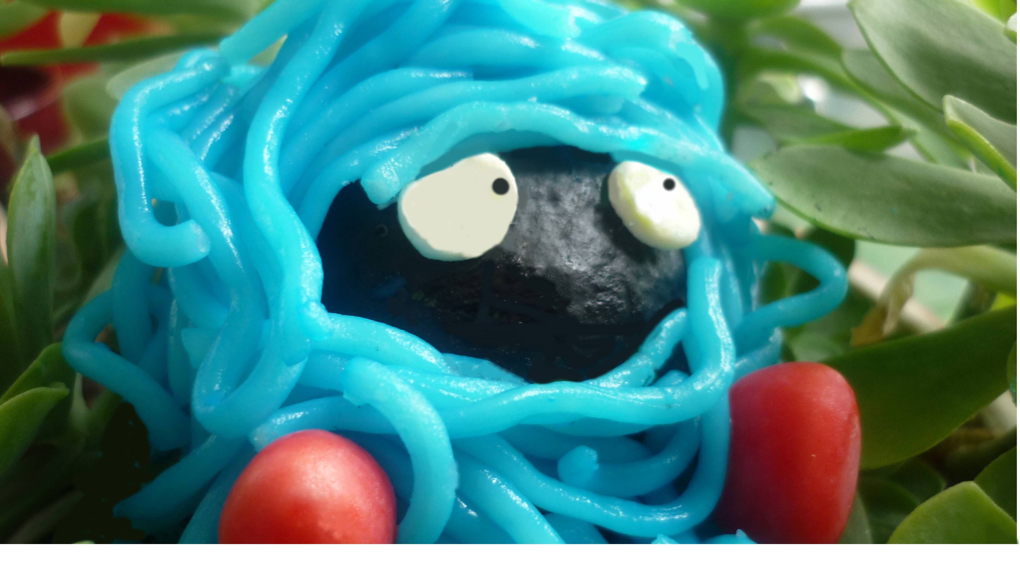 Tout est comestible dans ce saquedeneu ! Un citron vert peint à l'encre de seiche, des morceaux de mozzarella pour les yeux, des bonbons ( oui, ceux qu'on ne mange jamais dans les paquets de haribo, qui essayent de nous piéger avec leurs faux airs de tagada !) pour les pieds et enfin de bons ramens colorés pour les...noeuds ?