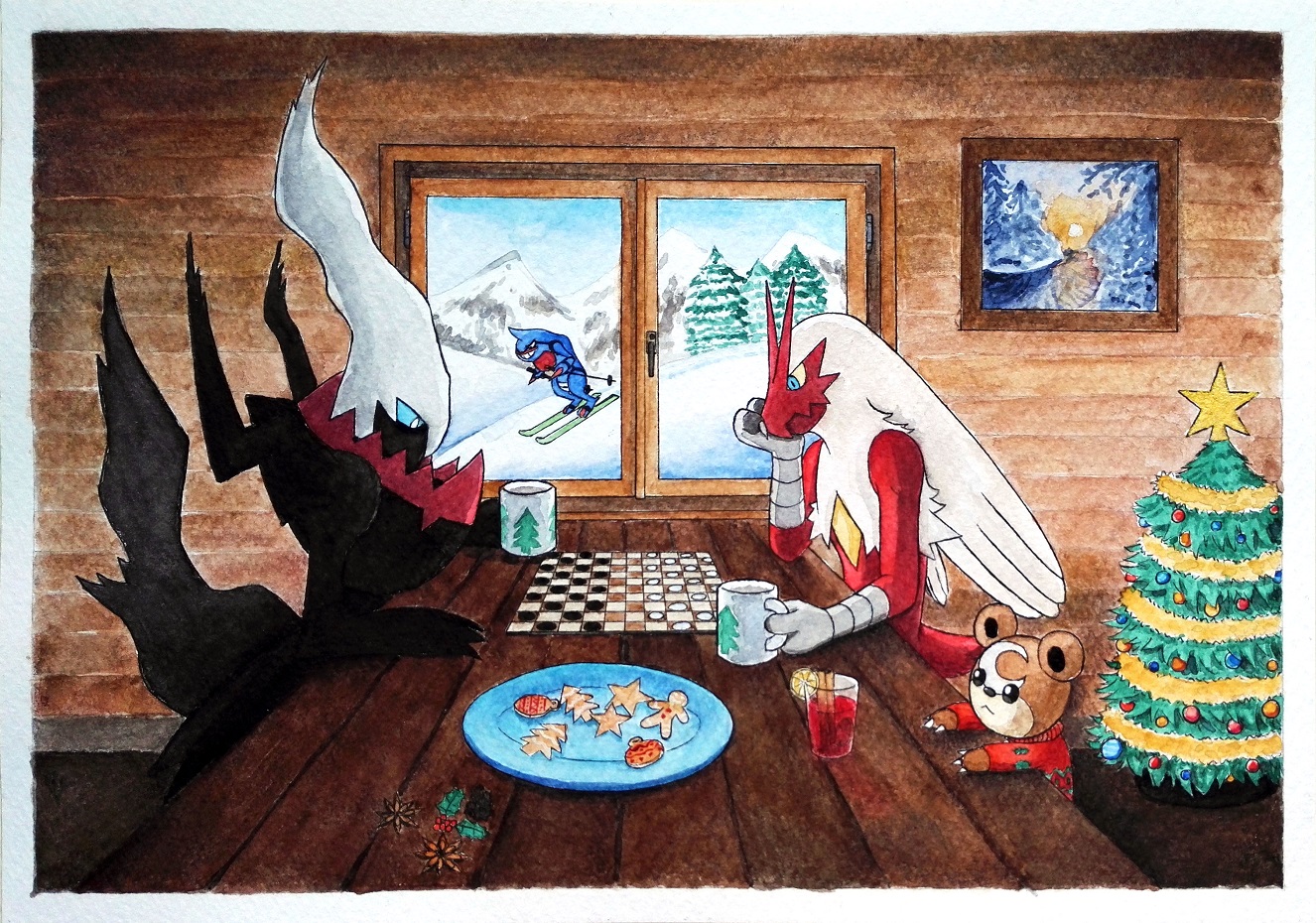 Voir l'image en grandComme j'avais fini mes autres dessins et qu'il me restait du temps, et que Takinou savait qu'il n'aurait pas le temps de dessiner pour Kyrameru, il m'a demandé de le remplacer :) Fait entre le 23 et 24/12, à l'aquarelle et aux crayons de couleur. J'ai eu du mal à prendre une bonne photo à cause de la texture du papier et des reflets.