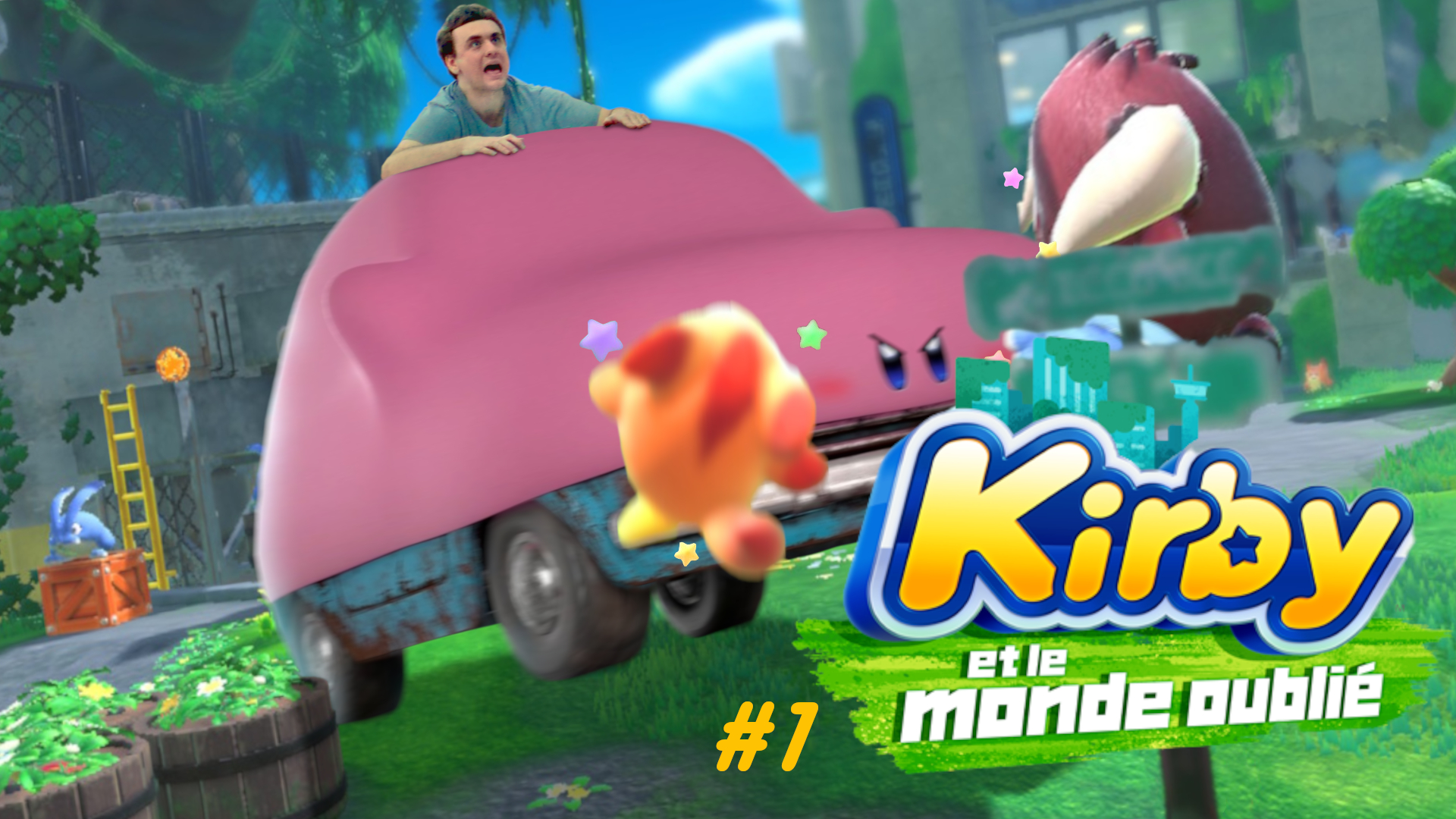 Donc voilà, on a une image du premier niveau du jeu, avec kirby transmorphé en voiture qui défonce ses ennemis, et moi par dessus qui m'accroche comme je peux parce que ça va vite :v Beau résumé du jeu, en tout cas de ce premier monde ! La vidéo s'appelle "On roule sur le premier monde !", je voulais absolument une miniature où je suis perché sur kirby voiture qui traverse l'image, ça n'a pas été simple, mais je suis content du résultat ^^