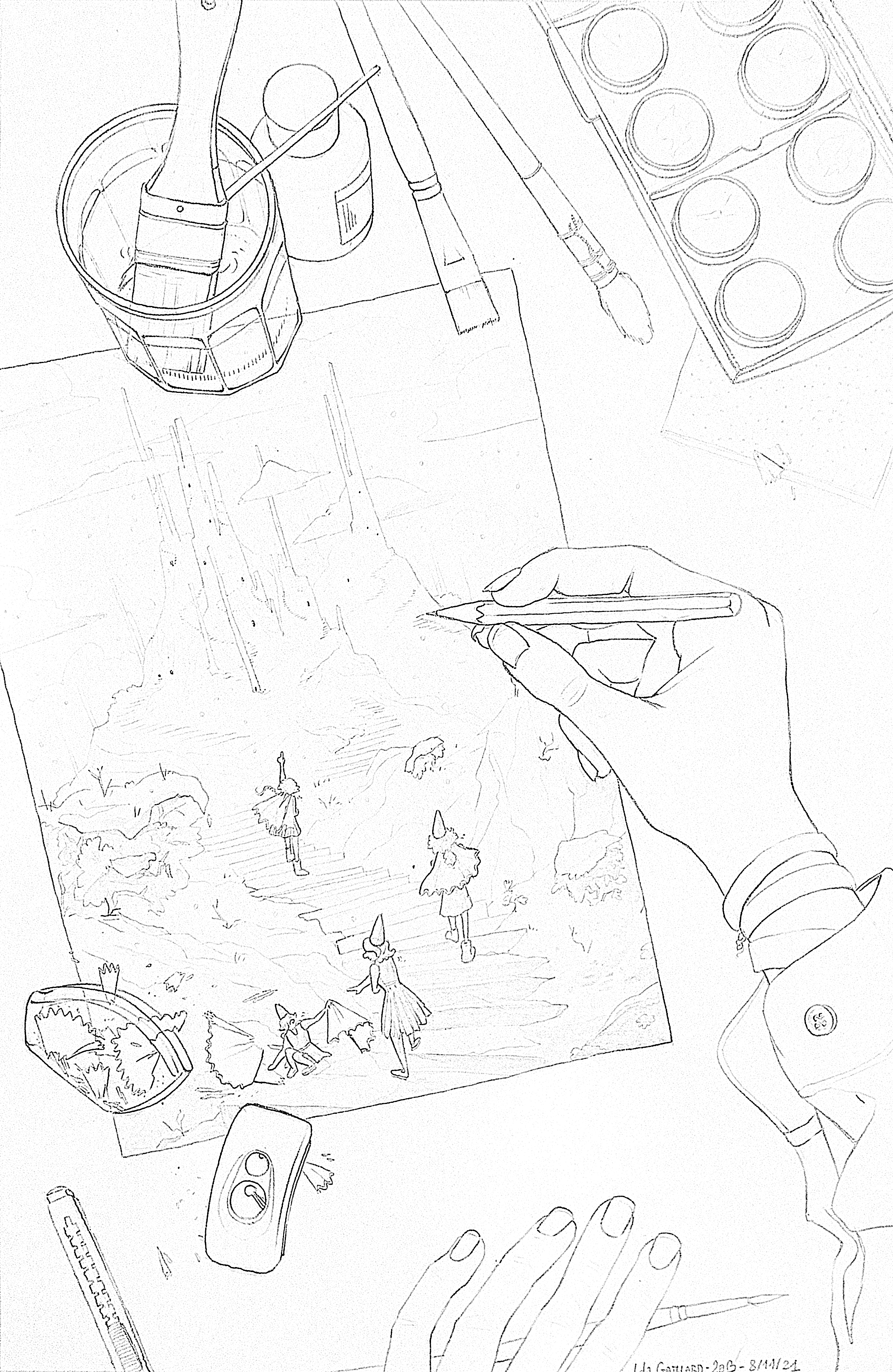 Cet exercice-là consistait à se dessiner en train de dessiner, en créant une interaction entre un élément du monde réel et l'illustration.Gnnnn celui-ci ne s'est pas bien passé. Au moment où ça ressemblait enfin à quelque chose j'ai foiré la couleur ; ce n'est pas grave, on sait comment ça se passe, je le referai pendant les vacances d'été parce que j'aime quand même bien mon crayonné !