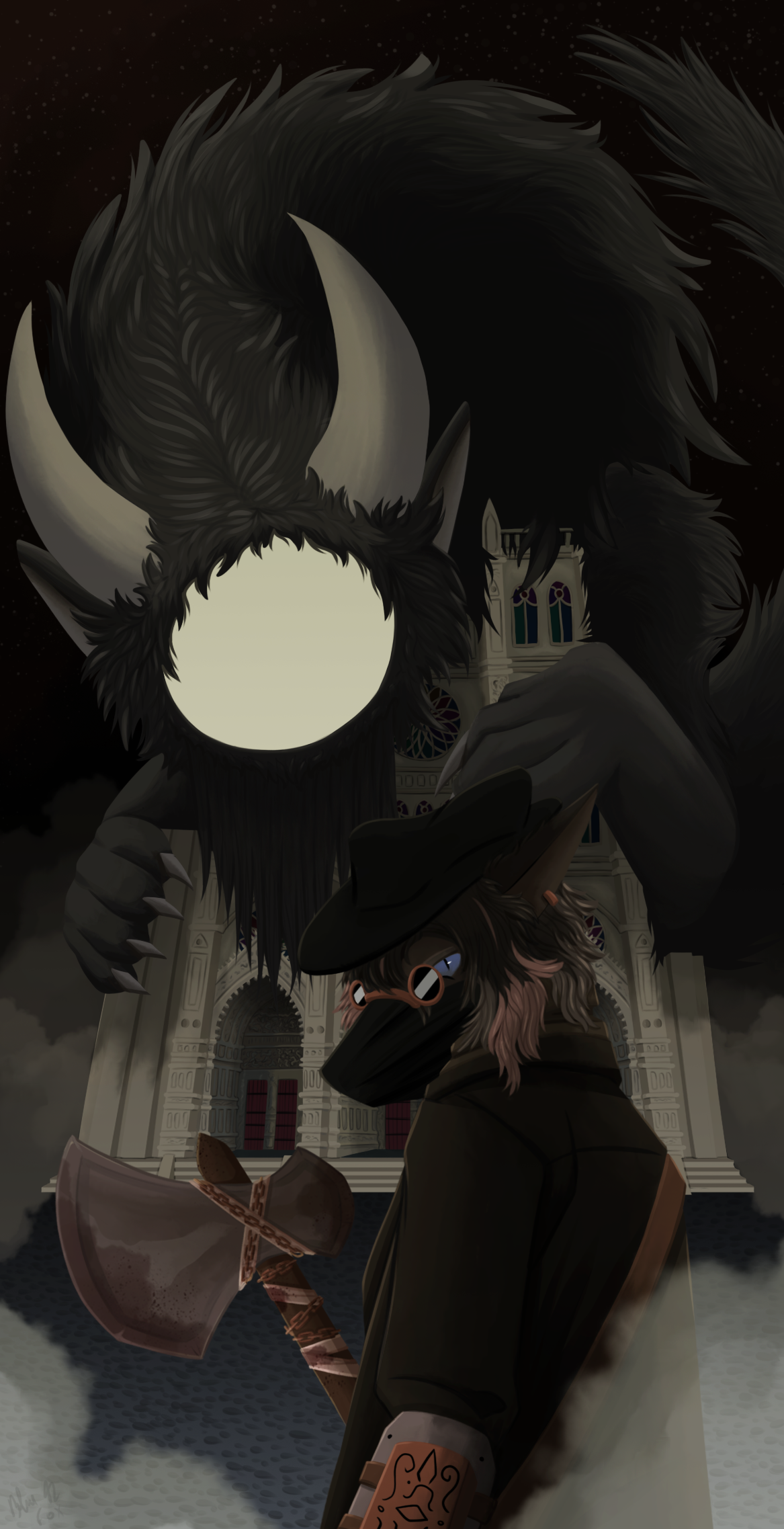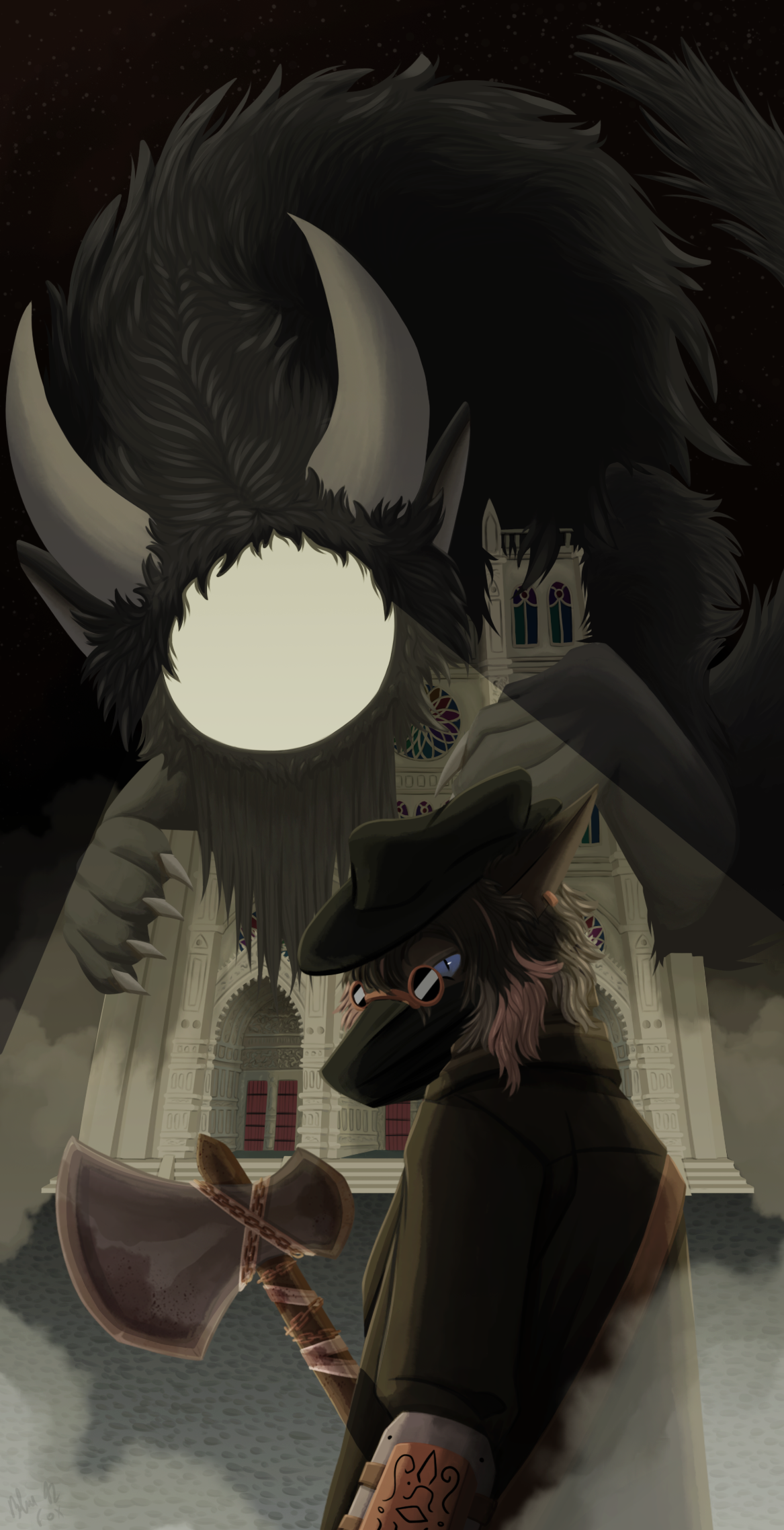Artur (personnage de MINTLEFLOWER), le personnage en avant-plan, est un OC basé sur le jeu Bloodborne. Andromeda (personnage de FluffyMoose), la grosse bestiole, est un alien qui peut générer de la lumière à partir de son "visage" (lumière qui peut aussi servir à tuer, si la bestiole en a envie). Je voulais dessiner Andromeda en train de "flasher" quelqu'un, mais je ne savais pas qui... Puis j'ai pensé à chercher un OC Bloodborne pour faire une scène genre "Combat/Rencontre de boss" (Je ne sais pas si ça passe bien maibon, au moins j'ai essayé) et j'ai trouvé Artur!