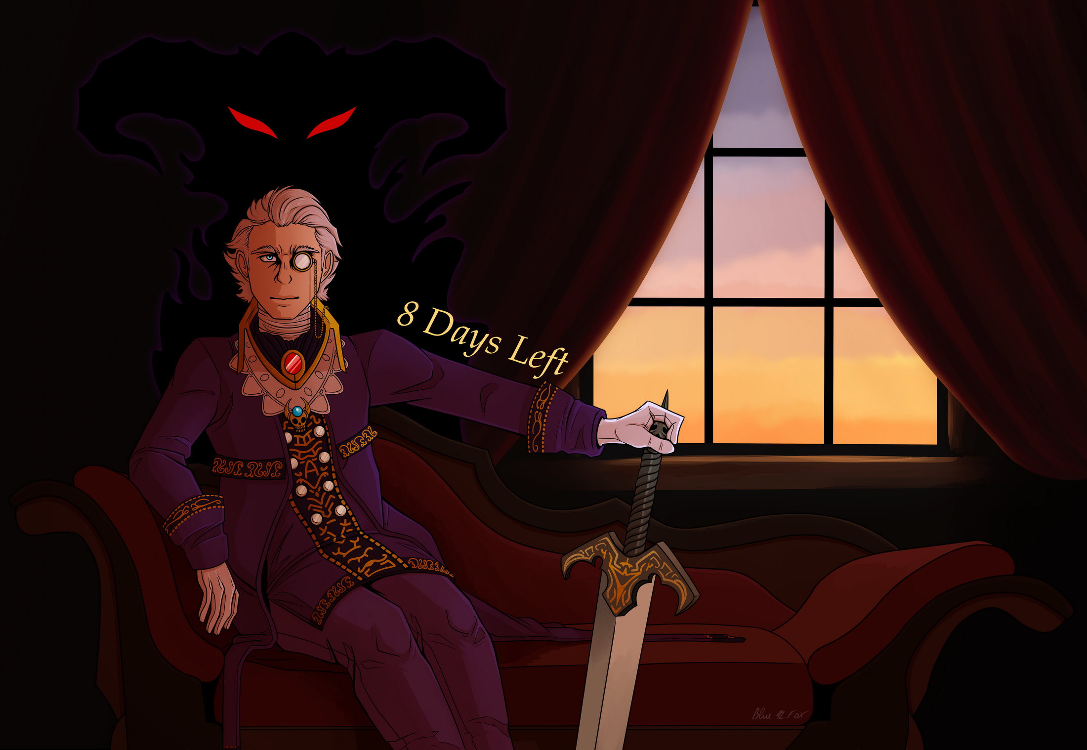 Bien sûr il a une forme démoniaque mais étonnement j'ai préféré dessiner sa forme humaine. Mais il y'a quand même un clin d'oeil à sa véritable forme dans le fond (l'ombre aux yeux rouges derrière lui) !
