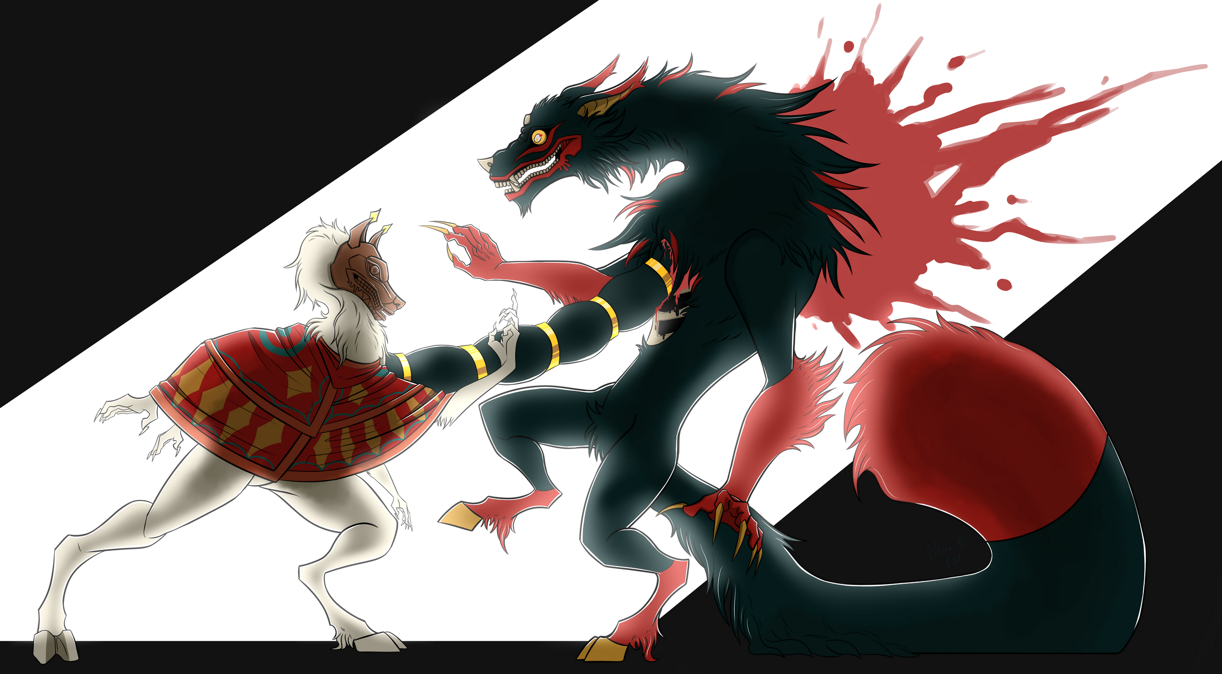 Les deux personnages appartiennent à Sitruunas. Le Boondoggle (en noir) est un dieu qui représente le Mal et le Soothsayer (en blanc) est un dieu qui représente le Bien. Après un crime impardonnable (on sait pas vraiment quoi), Soothsayer a décidé de bannir Boondoggle en le transperçant avec son dard de scorpion. Du coup c'est ce que j'ai essayé de représenter !