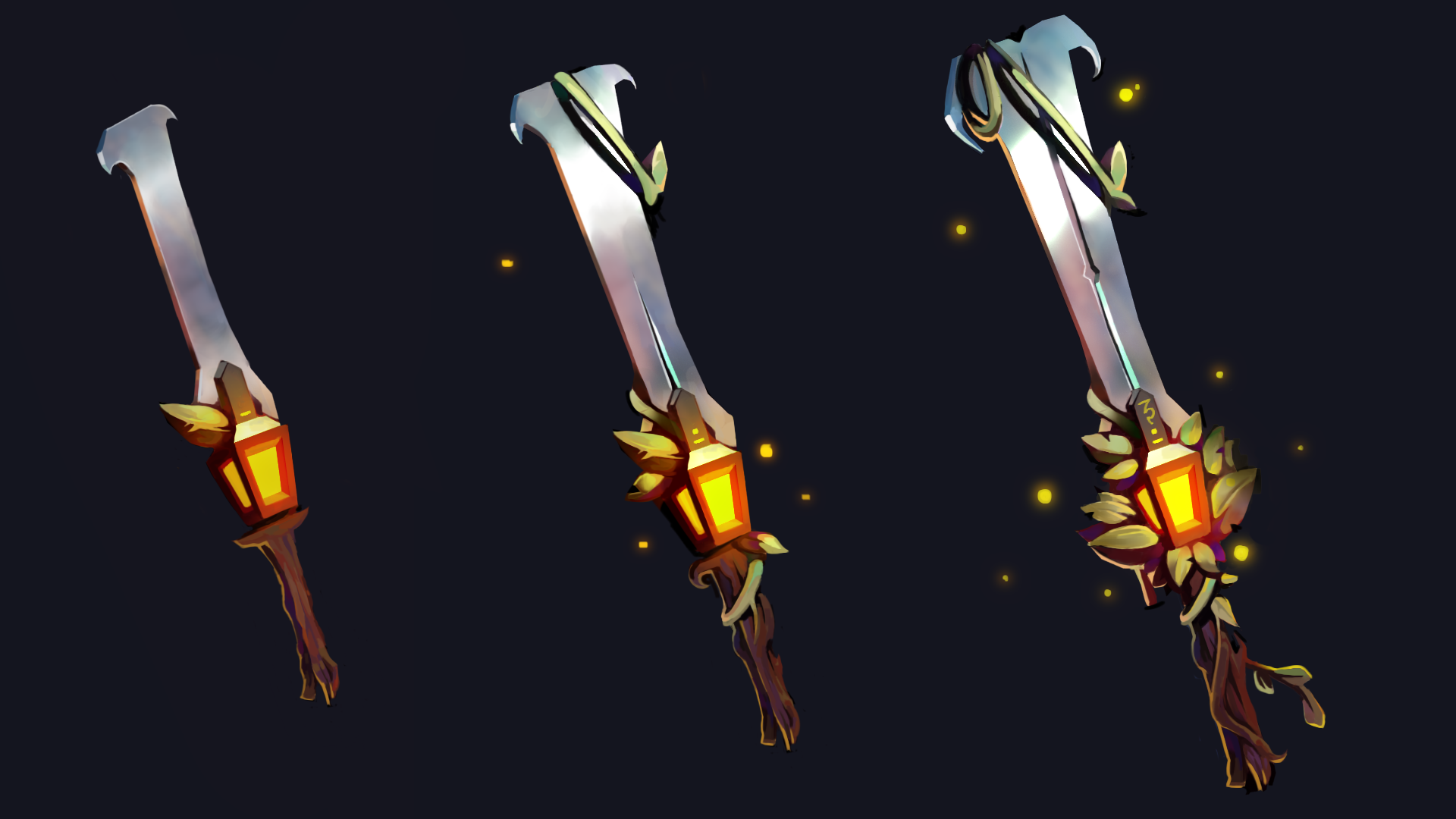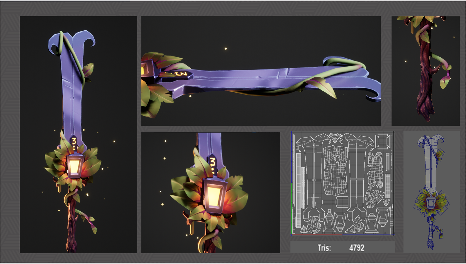 Concept d'une Claymore suivie de la réalisation en 3D. J'étais sur un timing très court (ça se voit sur les feuilles et le shader de la lanterne :(). On devait faire une arme mais j'en ai fait deux donc karma hein. La lanterne brille/clignote mais la vidéo est vraiment trop lourde donc tant pis. J'me suis vraiment amusée sur ce projet.
