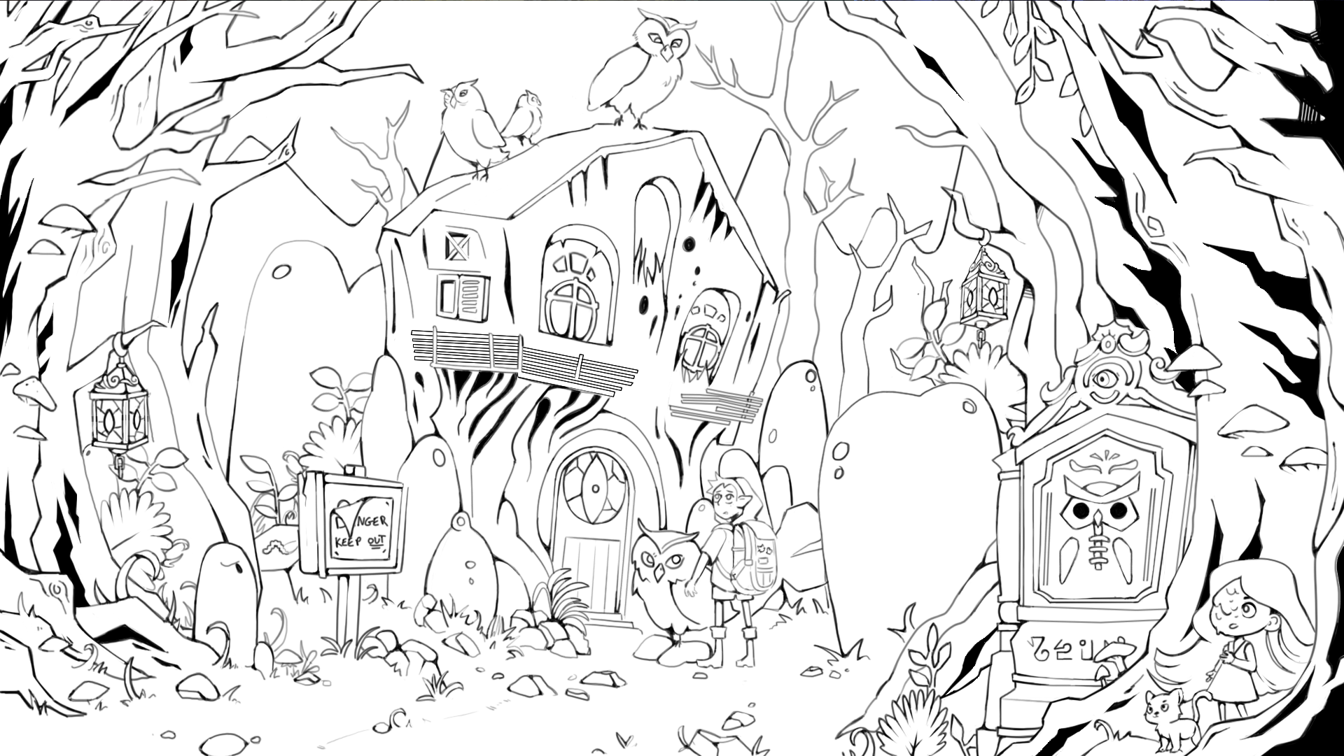 Upside-Down projet. Le but était de faire transitionner le dessin du dessus vers le bas. Donc chaque Plan/élément est séparé et bouge indépendamment et les parties non visible des arrières plans sont quand même dessinées/coloriées. Évidemment, je n'ai pas fini (je suis rentrée avant la fin de cette matière haha) mais peut-être que je continuerai pas moi-même après. C'était mon plus gros challenge pour le cours, vu ma connaissance minimale en matière de décors. C'était vraiment intéressant à faire et j'ai testé plein de technique différente. La colo aussi était très différente vu que le but final était d'animer les différents éléments. Franchement, ce workflow était super fun et j'espère trouver le temps et l'envie de le refaire