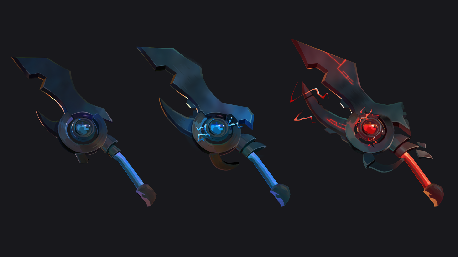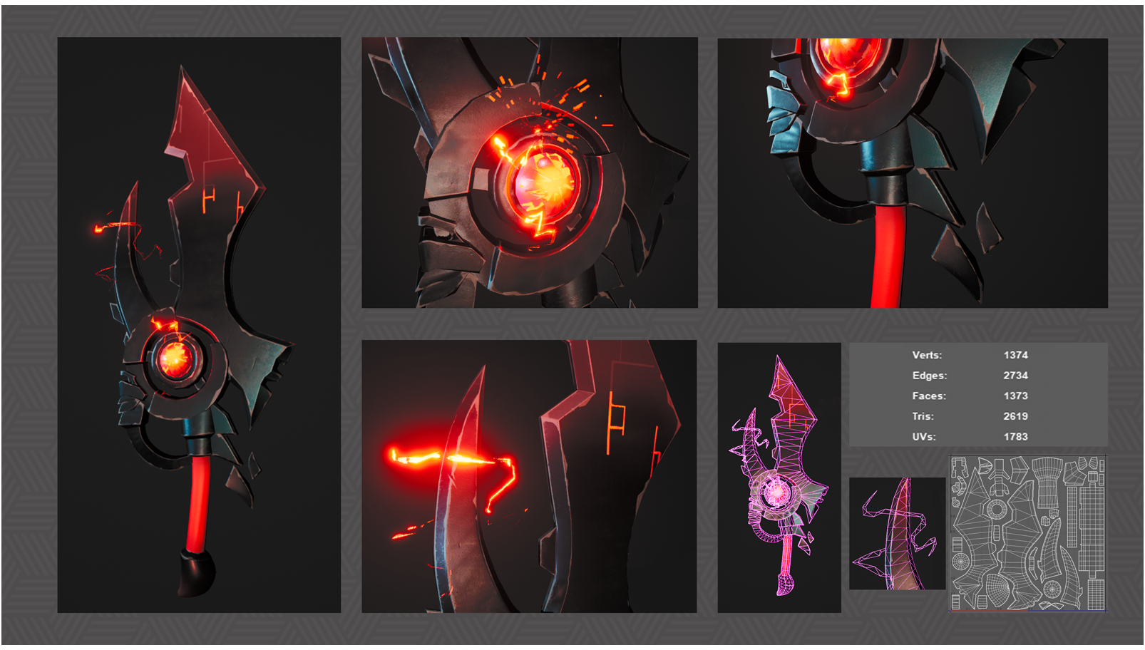 La deuxième arme du coup ! J'ai passé plus de temps sur celle-ci (c'est celle que j'ai fait en premier, même si je la poste en deuxième haha). Le design est beaucoup plus simple (le manche manque de détails) mais mon focus étaient vraiment sur les effets/shaders. Encore une fois, ça ne se voit pas très bien sur les screens, mais l'électricité est animé et parcours l'arme. Pareil pours les détails sur la lame qui s'illuminent progressivement. (vidéo encore trop lourde)
