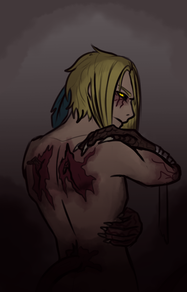 Toujours Nero. Les personnages avec une origine "Dark Urge", selon certaines conditions, débloquent à un moment une forme de "Ravageur". La forme de Ravageur n'est pas personnalisable dans le jeu, alors je me suis amusée à lui en dessiner une. Mais la base reste la même : 4 bras, une queue, des pattes digitigrades, des espèces de trous dans les mains/bras, des piques partout,... Après, dans ma partie avec lui, il ne débloque jamais cette forme tout simplement parce qu'il l'a refusée (on va dire que cette forme n'est disponible que pour les gens qui font une run "evil", sans trop entrer dans les détails). Du coup c'est juste un concept pour un AU avec encore plus de drama, eheh