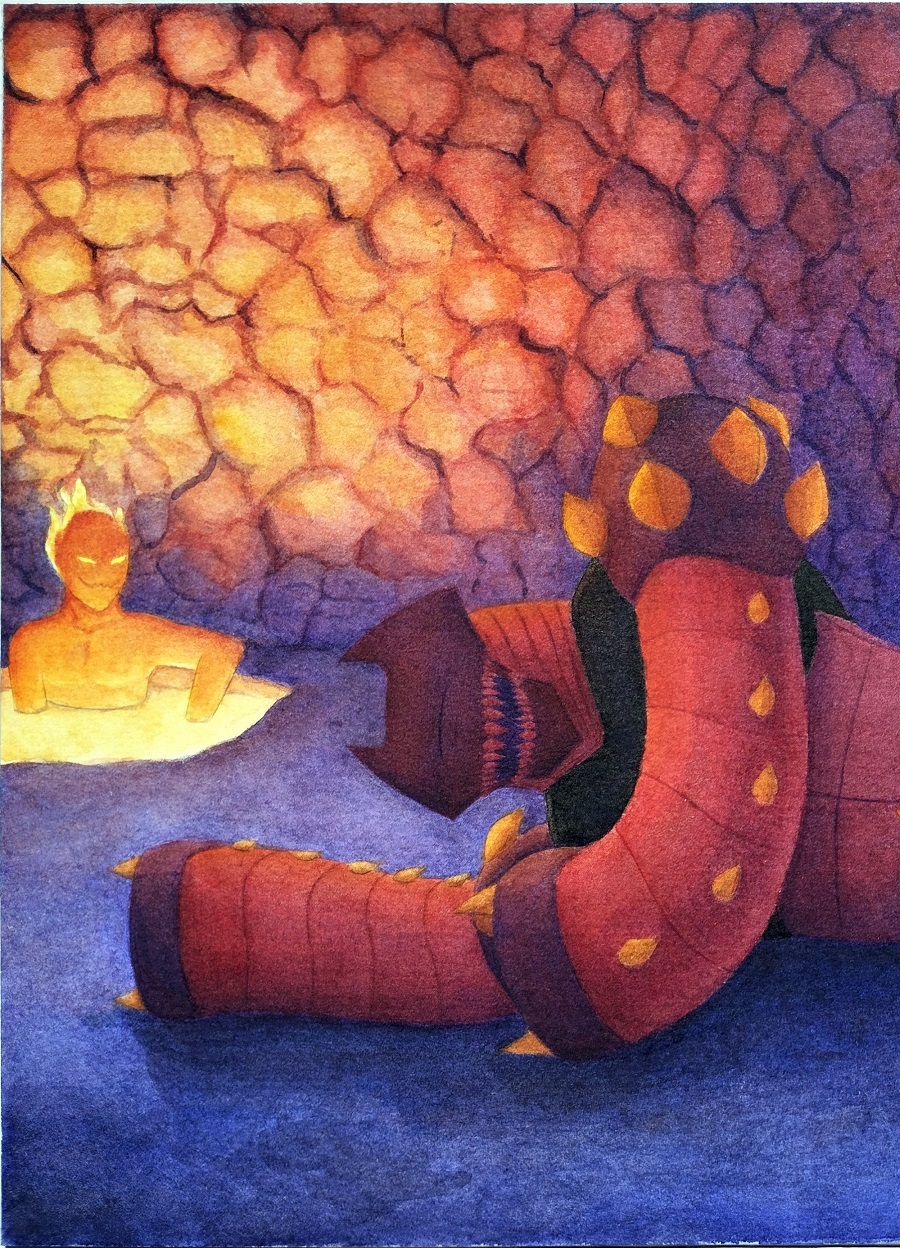 Mais j'avais envie de dessiner Bellroc et Nari quand ils étaient encore amis :) Et aussi de dessiner Skrael avec l'une de mes poses préférées. Dessins faits à la gouache dans mon carnet Moleskine ; son papier fonctionne beaucoup mieux avec la gouache que l'aquarelle. Le dessin d'en-tête mesure environ 11 cm de haut. Je n'ai pas encore l'habitude de peindre à la gouache, c'est beaucoup plus opaque que l'aquarelle et je ne vois plus mon croquis en-dessous.