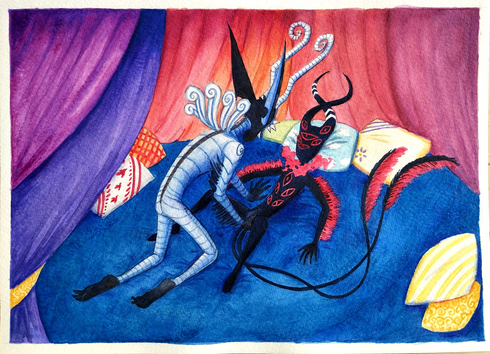 Coucou ! Voilà un petit dessin NSFW de mes OCs Ekhelmineon (violet) et Rengwir (brun), réalisé à l'aquarelle et aux Polychromos dans mon carnet Moleskine :) Fait le 20/02/2022.