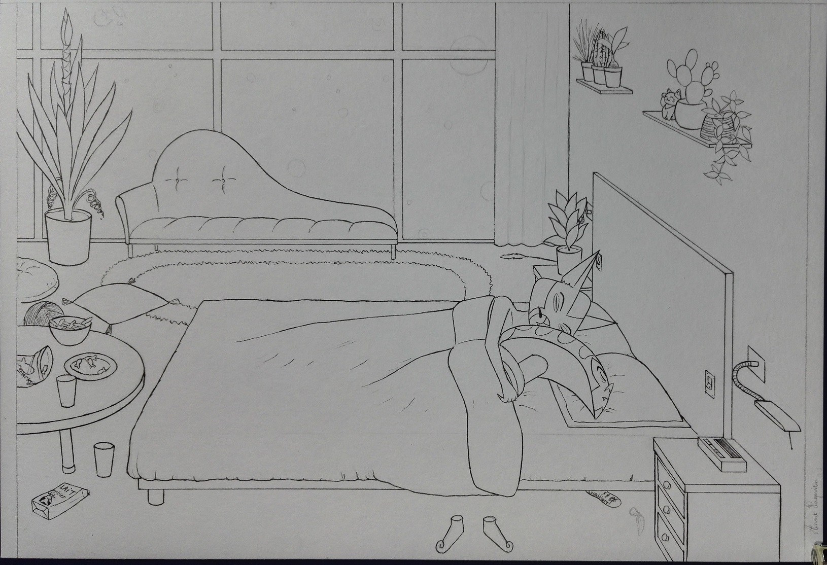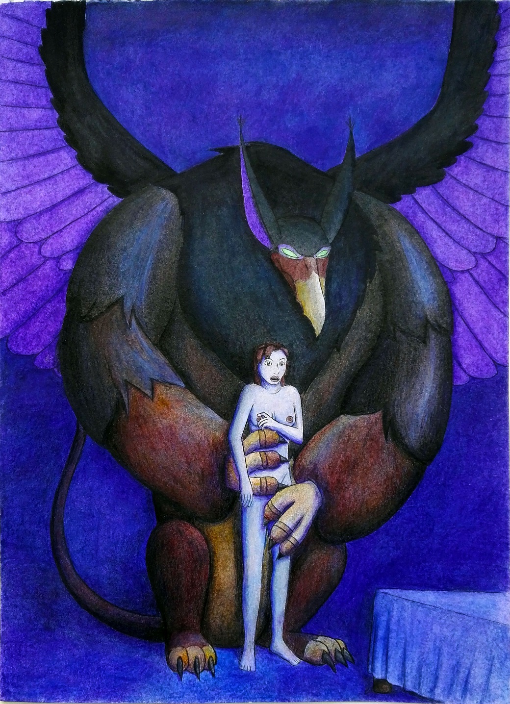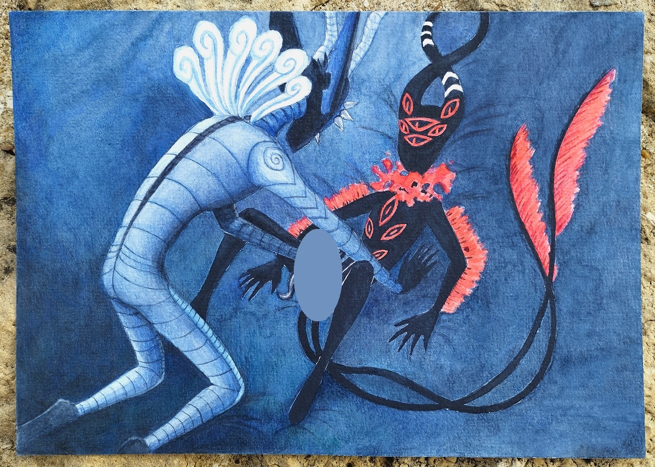 Papier Clairefontaine A5. Aquarelle et Polychromos. Le fond était bien plus compliqué à faire qu'il n'y paraît. La version non censurée est sur DeviantArt. Réglisse a des tentacules entre les jambes.