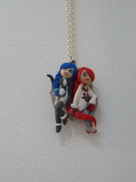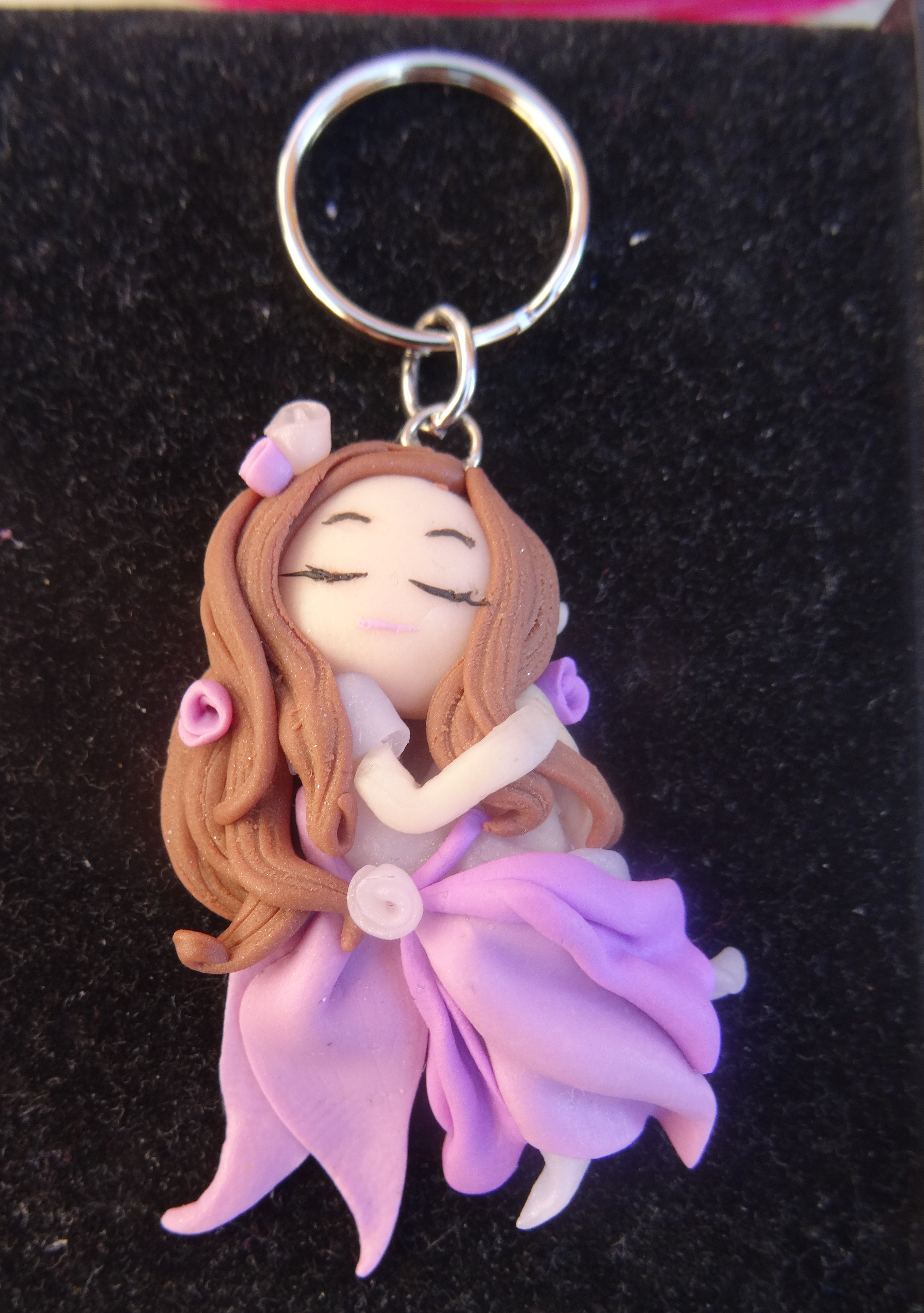 Voir l'image en grandJ'ai eu du mal à faire les cheveux, j'ai réussi à faire un dégradé de violet mais sur le moment ça me semblait trop compliqué d'inclure le blanc et de le garder pur, du coup j'ai joint la pâte violette à la blanche puis j'ai peint à l'acrylique pour essayer de faire une transition. J'ai recouvert les cheveux de vernis pour empêcher la peinture de partir.
