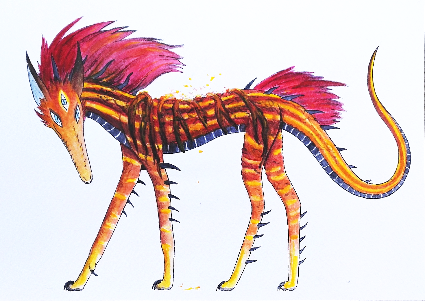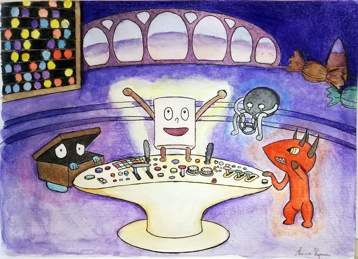La mise en couleur a majoritairement été faite à l'aquarelle, avec un peu de crayon de couleur pour homogénéiser certaines zones.