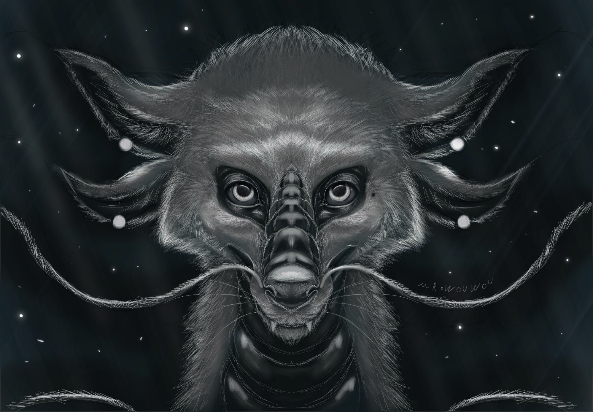 Voir l'image en grandEnsuite, du noir et blanc, et là c'est un peu rigolo, si je vous jure ! Ça faisait partie des travaux imposés à faire depuis chez nous pour notre bande démo, il fallait choisir parmi 3 prompts (j'ai choisi "un vaisseau arrive sur une planète hostile"), puis en faire une image, faire attention à la compo, la lumière, et les couleurs. Voulant faire un peu d'encrage lourd, je m'exécute, assez vite car en retard sur mon planning (au point de juste prendre une ref de vaisseau pour aller vite), jusqu'à me dire que mince, j'aime bien en noir et blanc, ça donnait un petit air d'illustration de roman ou de vieil article de journal (d'où le titre dans cette typo, vous l'avez ?), alors j'ai défendu mon choix délibéré de ne pas ajouter de couleurs, et je préfère comme ça