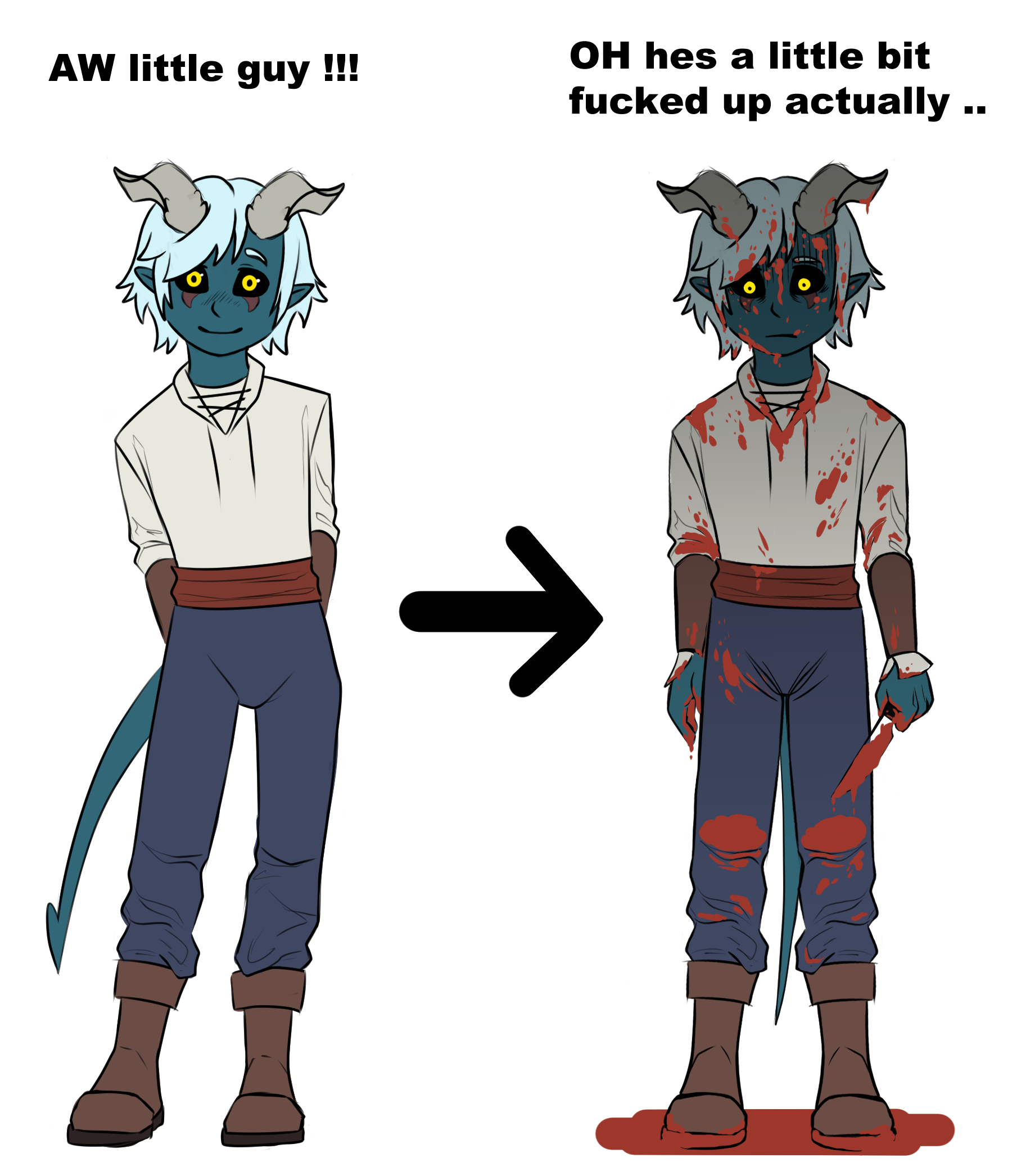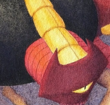 Contexte du dessin :Nick, le seigneur de la terre, n'a plus d'énergie et vient de reprendre sa forme humaine en territoire ennemi. En voyant Cyclope sortir de la lave il pense qu'il va se faire attaquer, mais comme je les ship (relation à sens unique entre 2 ennemis, dont un qui ne sait pas que l'autre a un crush sur lui, basée sur un malentendu et devenue de plus en plus toxique) je sais que ce ne sera pas le cas. Cependant Cyclope réfléchit à toutes les options, de la plus horrible à la simple libération de Nick.