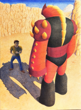 Enfin, un petit fanart du gormiti de lave Cyclope que j'ai fait pour me détendre vers le 07/08/2022. Le fond est à l'aquarelle, le personnage à l'encre de Chine.