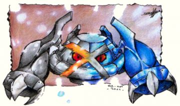 Le pokémon acier/psy se plaça à quelques mètres du groupe. Chacune de ses lourdes pattes s'enfonçait lourdement dans le sol à chaque pas et arrachait une motte de terre conséquente. Le pokémon devait peser plus de 600 kilos selon les estimations de Mikiro. Les deux Métangs avaient du évoluer pendant la nuit, pensa-t-il.