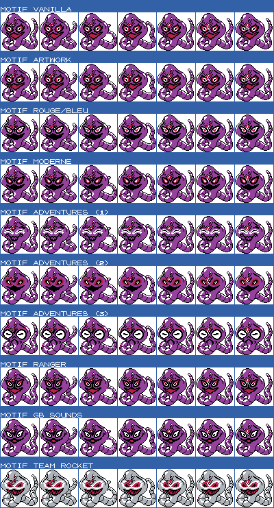 Une compil' de sprites édités, représentants tous les motifs connus du capuchon d'Arbok :