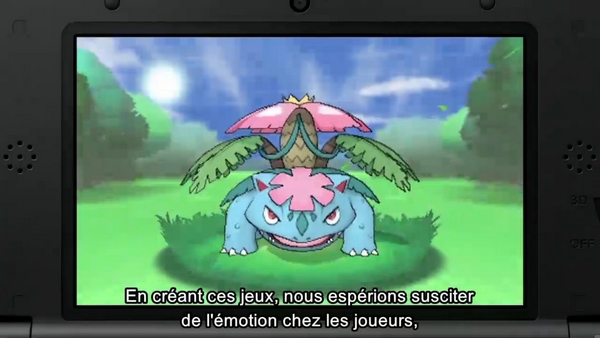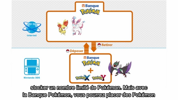 13:05 Présentation d'une application payante annuellement "banque Pokémon" qui permet de stocker les Pokémon en ligne sur un genre de cloud (100 boites x 30 soit 3000 Pokémon stockables !). Un équivalent "Poké transfert" permettra de faire la même chose depuis les versions Noire / Blanche (1 et 2)