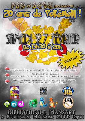Les associations PAD et AEST vous présentent, en l’honneur de l’anniversaire de Pokémon, l’événement « 20 Ans De Pokémon ! » le 27 février prochain, dans lequel elles vous proposerons plusieurs activités autour de cette désormais fameuse licence.Adresse