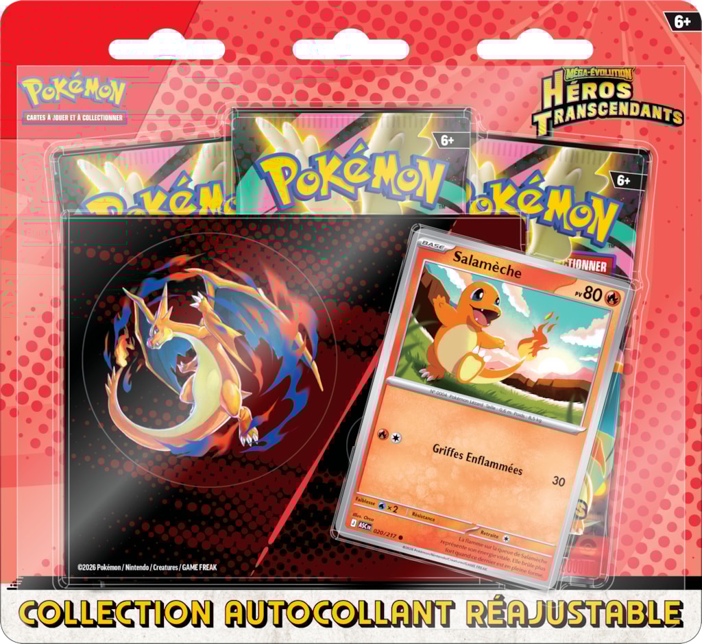 Collection autocollant réajustable Méga-Évolution – Héros contenant 3 boosters Méga-Évolution – Héros Transcendants, une carte promo au style «rare » de Salamèche ou de Fantominus et une page d’autocollants représentant Méga-Dracaufeu Y ou Méga-Ectoplasma, respectivement, pour personnaliser des ordinateurs, des tablettes et autres appareils électroniques ;