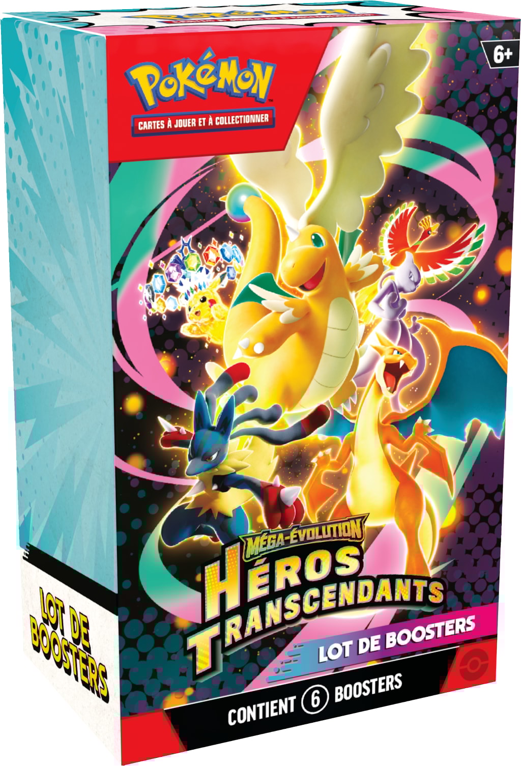 Lot de boosters Méga-Évolution – Héros Transcendants contenant 6 boosters Méga-Évolution – Héros Transcendants.