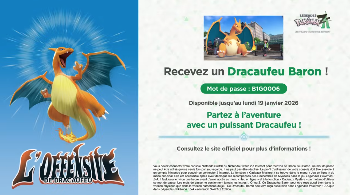 Légendes Pokémon Z-A : Distribution d'un Dracaufeu pour l'arrivée du DLC !