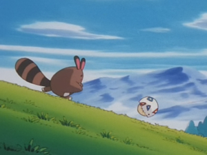 Pendant que nos héros font une sieste, Togepi s'écarte et s'amuse avec un Fouinette sans se douter que la Team Rocket approche avec une nouvelle invention...